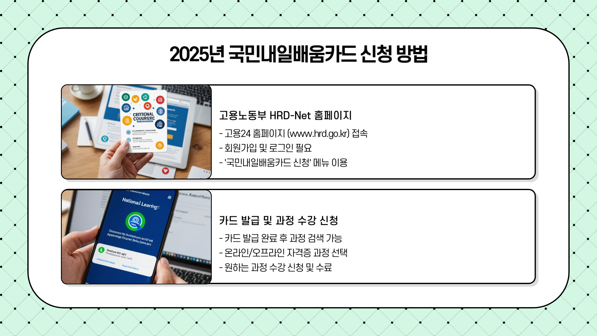 신청방법은 고용24 홈페이지에서 온라인으로 신청하면 됩니다. 단계는 회원가입 → 카드 신청 → 자격 확인 → 수강 신청 순입니다.