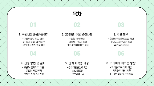 지금 바로 국민내일배움카드 신청방법을 따라 도전해보세요. 신청자격도 아주 유연하게 바뀌었기 때문에 거의 모든 분들이 이용하실 수 있어요. 고민만 하다 보면 2025년도 금세 지나갑니다. 자격증 하나로 내 커리어의 방향을 바꿔보고 싶은 분들이라면, 바로 지금이 기회입니다. 망설이지 마세요. 국민내일배움카드로 내일을 준비하세요!