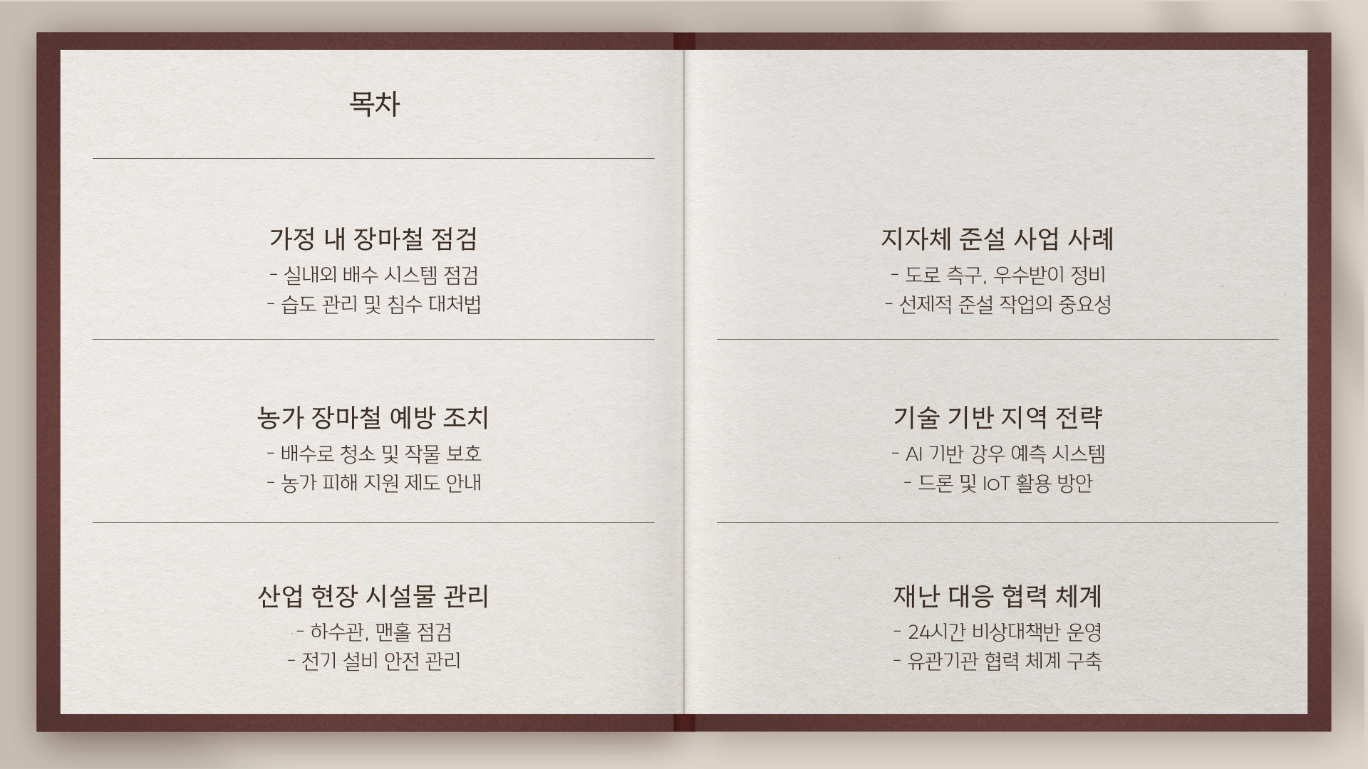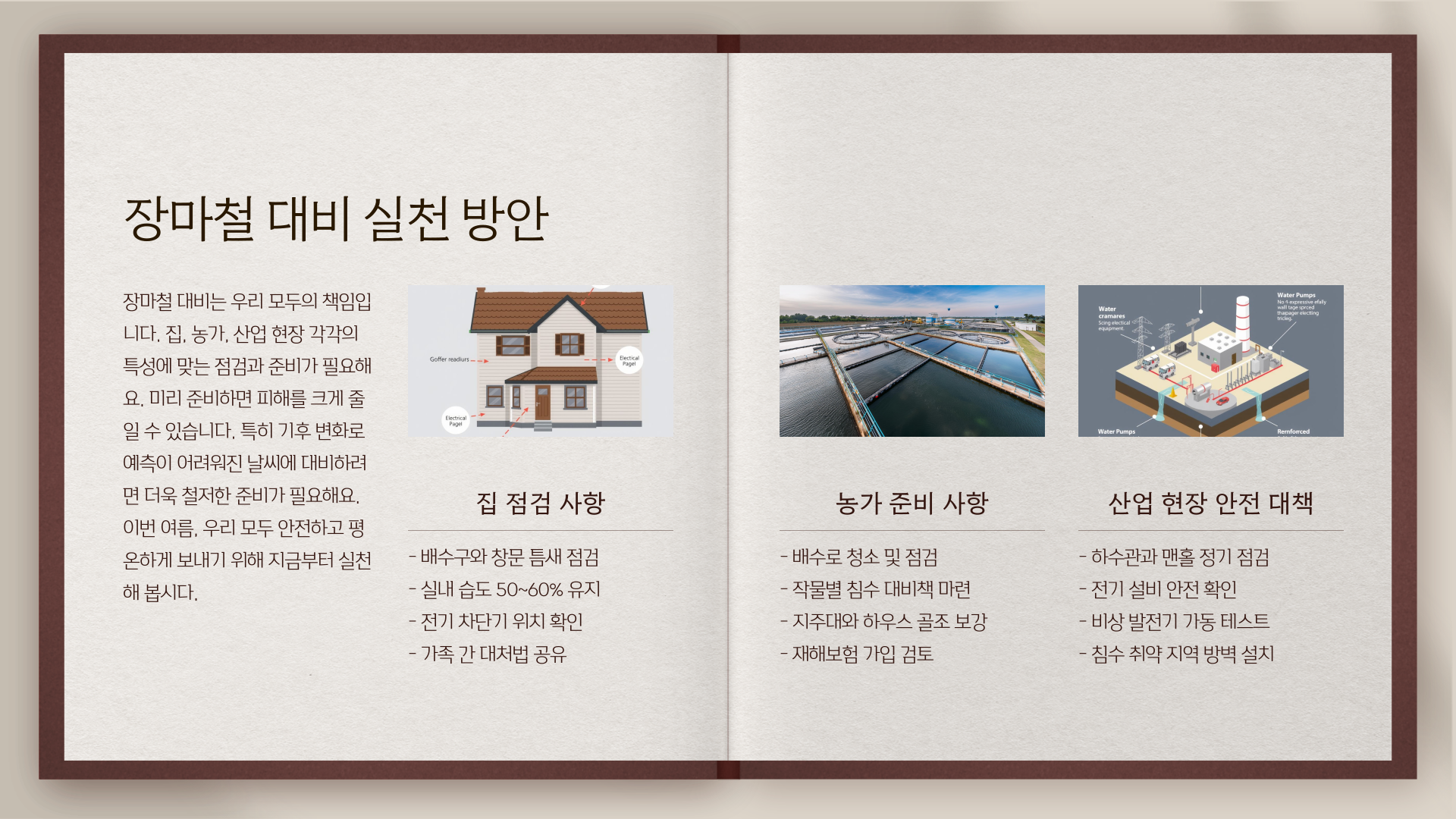 어쩌면 이번 여름은 더 거세고 예측하기 어려운 장마를 동반할지도 몰라요. 그렇기 때문에 오늘 정리한 집, 농가, 산업 현장별 점검 사항들을 한 번쯤 꼼꼼히 읽어보셨다면, 지금 당장 실천에 옮겨보는 건 어떨까요? 작은 준비가 큰 피해를 막고, 한층 더 안전하고 평온한 여름을 만들어줄 수 있을 거예요. 여러분도 저처럼 장마철에 대한 긴장감을 조금은 덜어내시고, 보다 여유롭고 똑똑하게 대비하시길 바랍니다. 비 오는 날의 불안함보다, 준비된 마음이 주는 든든함이 더 오래가니까요.