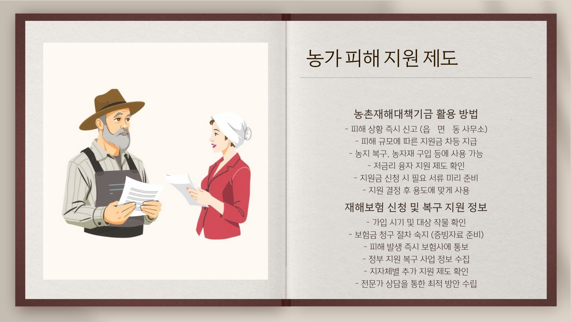 그리고 벼처럼 침수에 민감한 작물은 더 각별히 신경 써야 해요. 태풍 대비용 지주대는 튼튼히 고정하고, 하우스 골조는 미리 보강해 두는 게 좋아요. 피해가 생겼다면 농촌재해대책기금이나 재해보험 등을 활용해 복구 지원을 신청할 수 있으니, 미리 관련 정보를 알아두는 게 유리하죠.