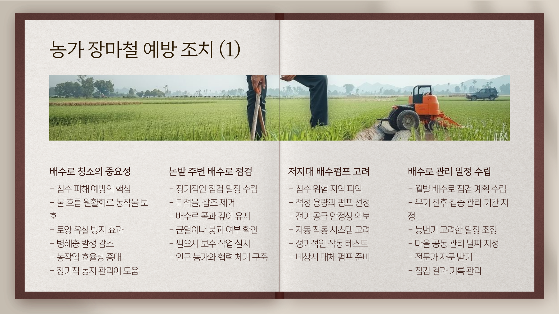 농작물은 비 한 번에 생사 여부가 갈릴 수 있어요. 그래서 비 오기 전부터 철저히 대비해두는 게 중요하죠. 가장 먼저 할 일은 배수로 청소예요. 논밭 주변 배수로에 이물질이 쌓여 있으면 순식간에 물이 고이고, 결국 침수로 이어지거든요. 막힌 곳은 없는지 직접 확인해 보세요. 저지대에는 배수펌프도 고려해볼 만해요.