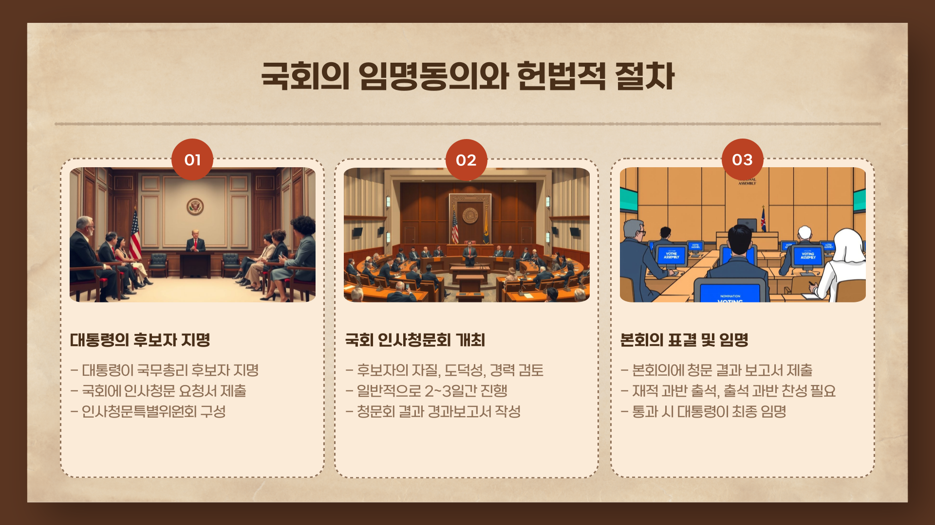 총리 임명은 대통령이 "넌 총리!"라고 말해서 끝나는 게 아닙니다. 헌법과 국회법에서 정한 공식 절차를 따라야 하죠. 대통령이 후보자를 지명하고, 국회에서 인사청문회가 열린 뒤 경과보고서가 제출됩니다. 마지막으로 국회의 동의를 받아야 최종 임명이 가능해요. 즉, 총리는 '대통령이 추천하고 국회가 검증한 인물'이라 볼 수 있죠.