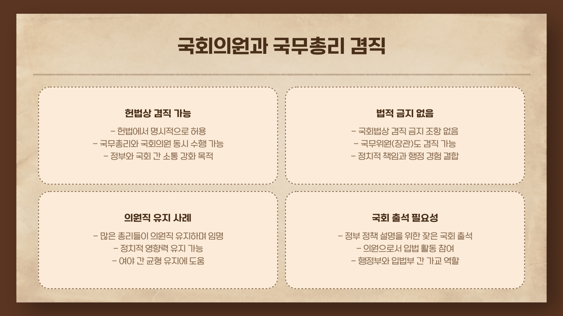 국무총리는 국회의원과 겸직이 가능한가요? 이건 꽤나 흥미로운 질문이에요. 의외로 "예"입니다. 법적으로 겸직 금지 조항이 없고, 실제로 많은 총리들이 의원 신분을 유지한 채 임명됐거든요. 총리로서 정부를 대표해 국회에 자주 출석해야 하다 보니, 이중 역할이 어느 정도 기능적으로 작동하기도 합니다.