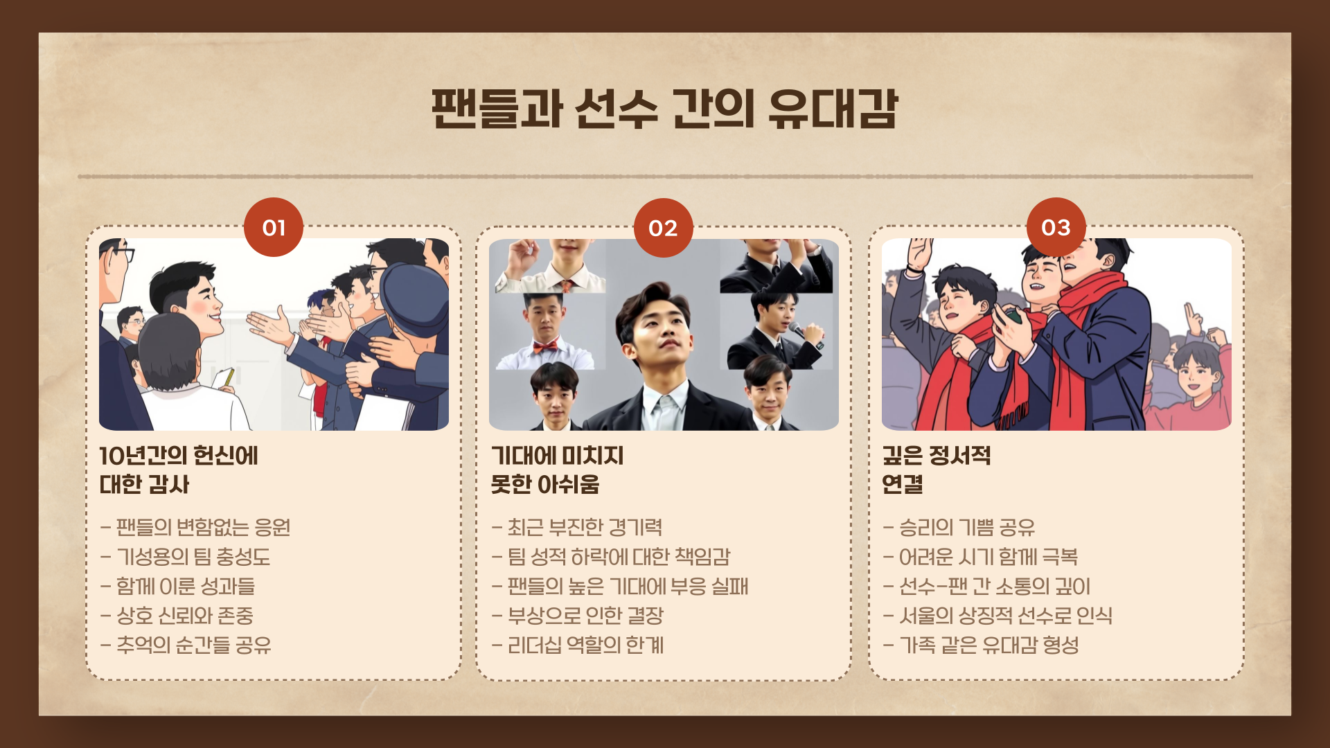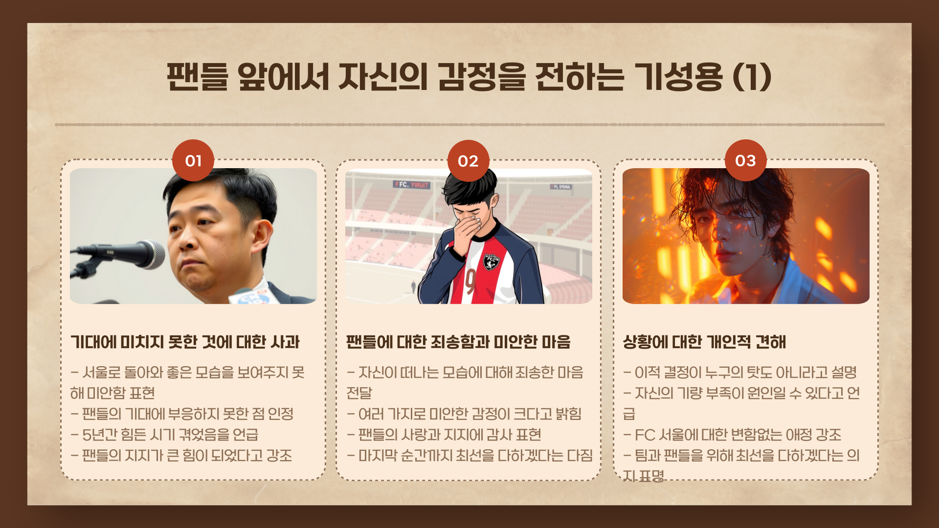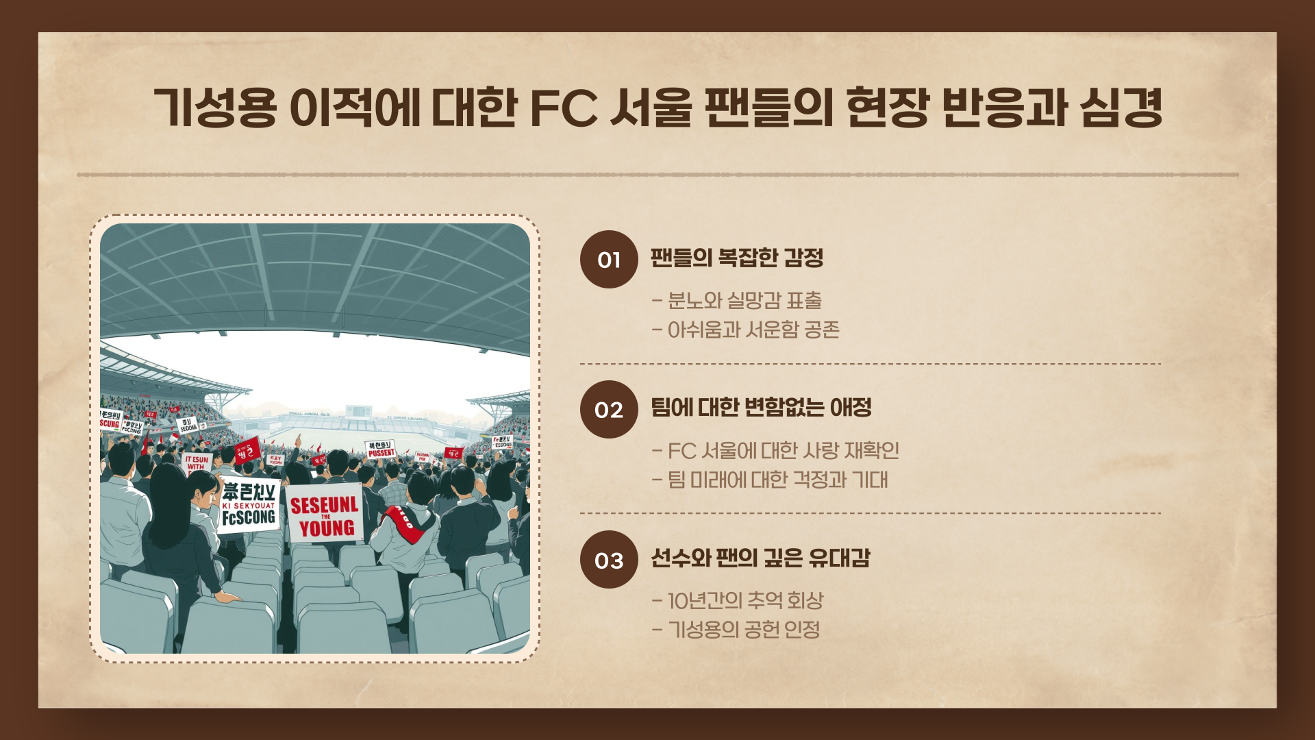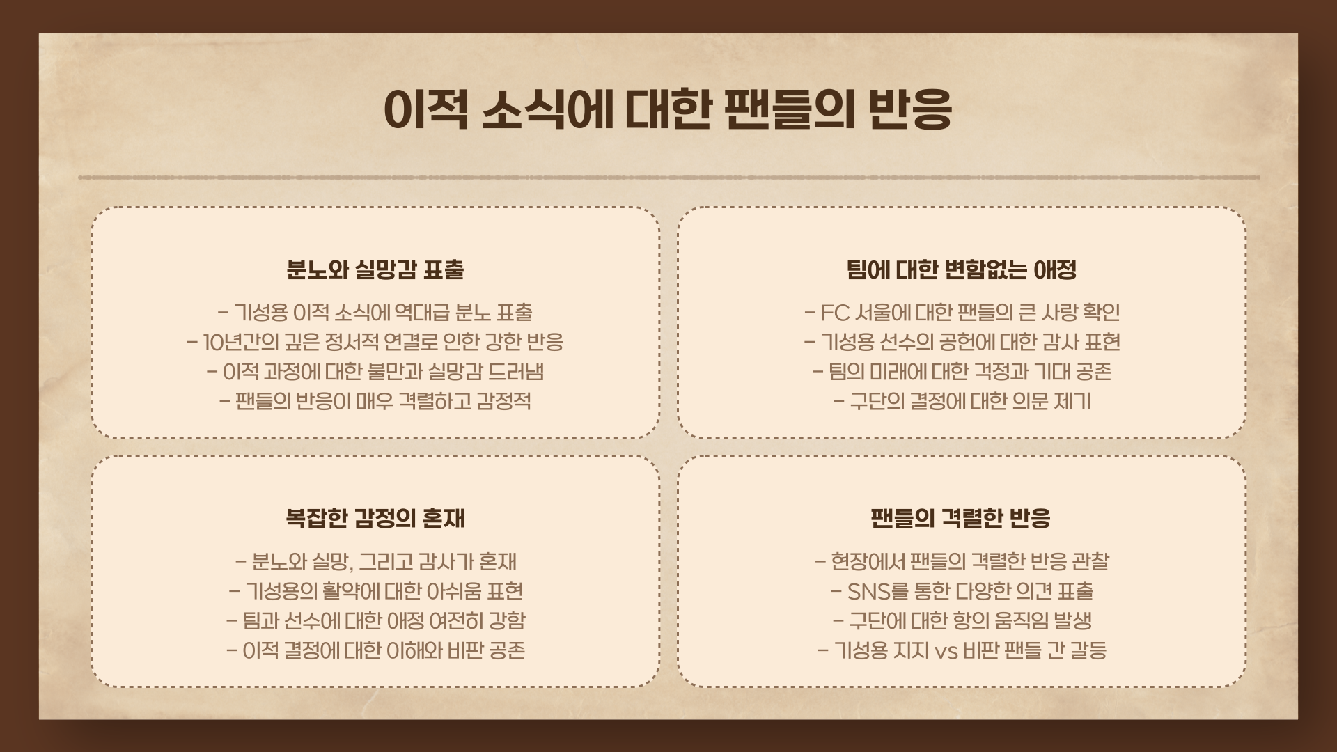 팬들은 그날 경기장에서 음악과 함께 마지막 응원을 보냈습니다. 일부는 눈물을 흘렸고, 또 일부는 조용히 박수를 보냈습니다. 기성용 선수는 이 따뜻한 반응에 고개 숙여 인사하며 다시 한 번 팬들의 건강과 행복을 기원했습니다. 팬들의 감정은 아래와 같이 요약될 수 있죠.