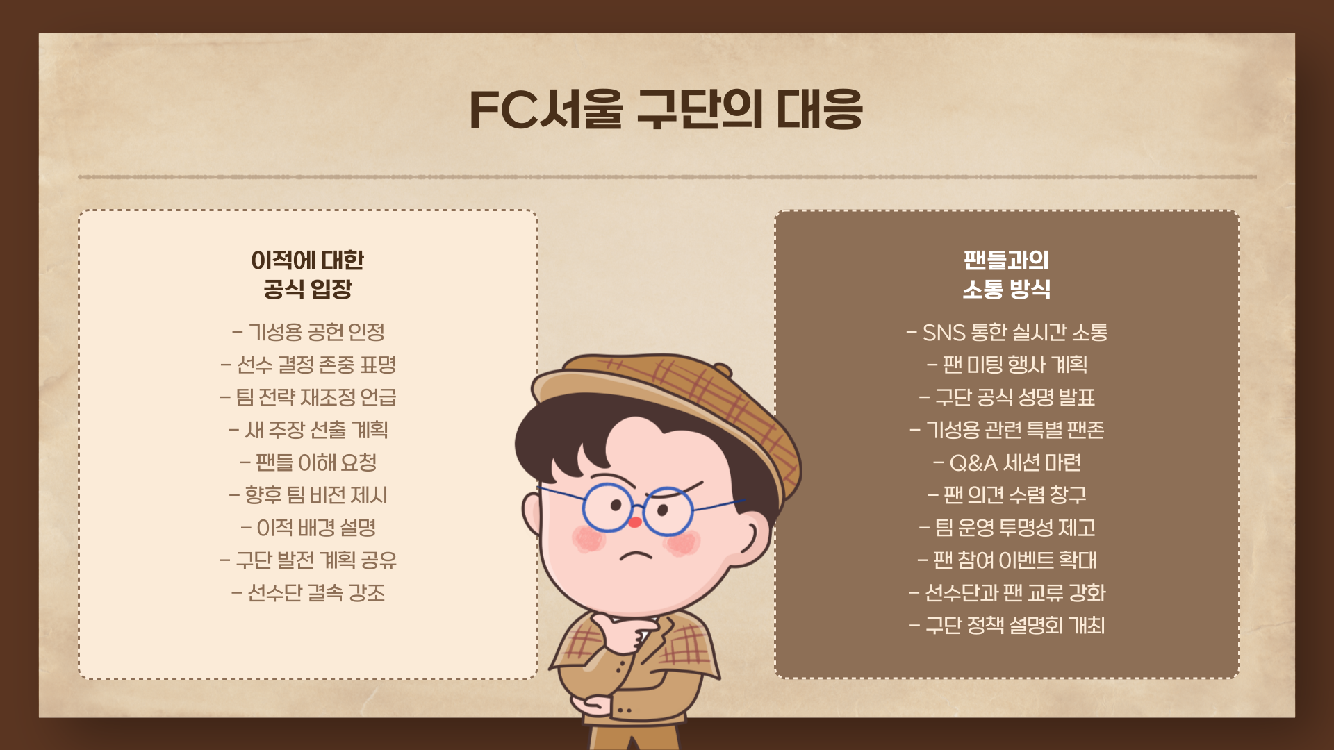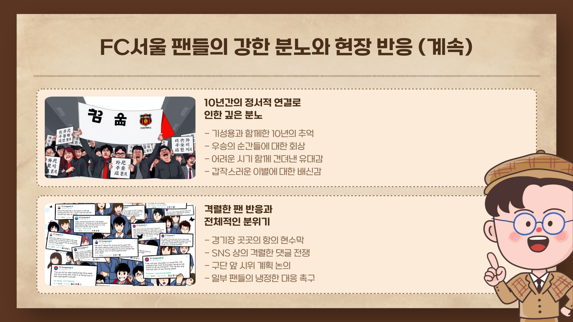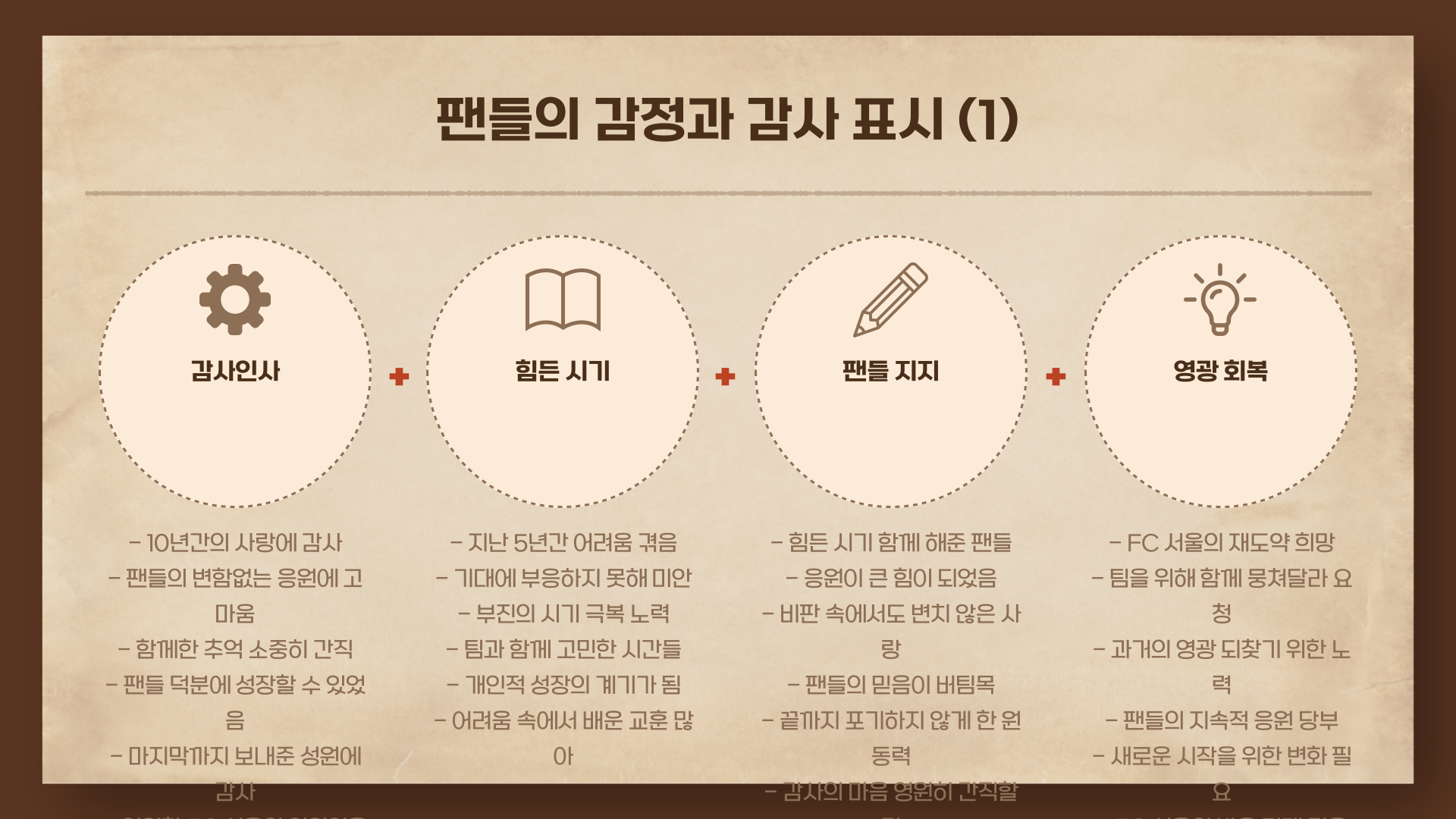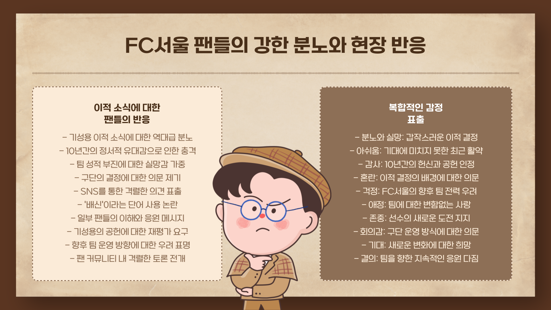 팬들은 그날 경기장에서 음악과 함께 마지막 응원을 보냈습니다. 일부는 눈물을 흘렸고, 또 일부는 조용히 박수를 보냈습니다. 기성용 선수는 이 따뜻한 반응에 고개 숙여 인사하며 다시 한 번 팬들의 건강과 행복을 기원했습니다. 팬들의 감정은 아래와 같이 요약될 수 있죠.