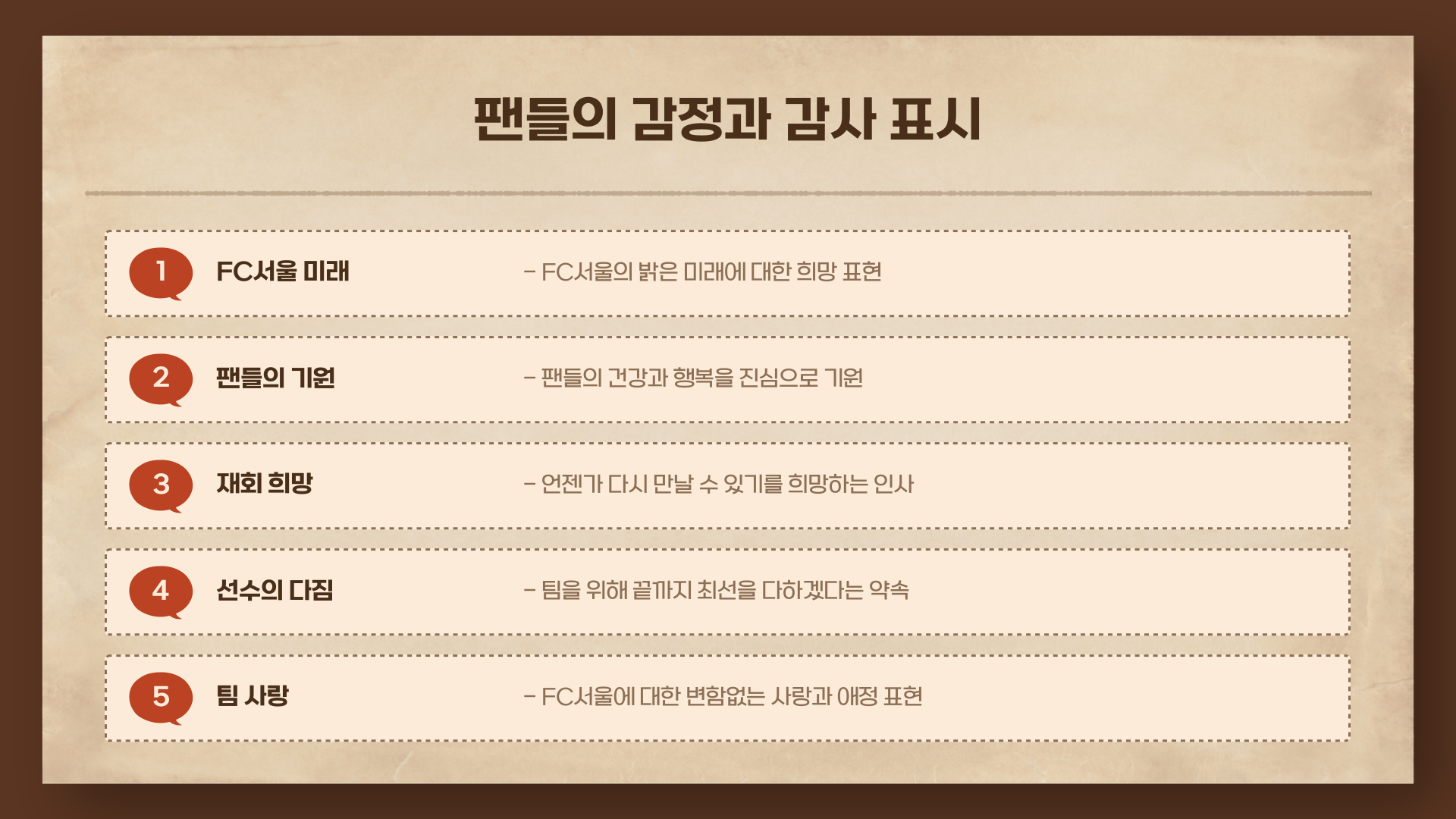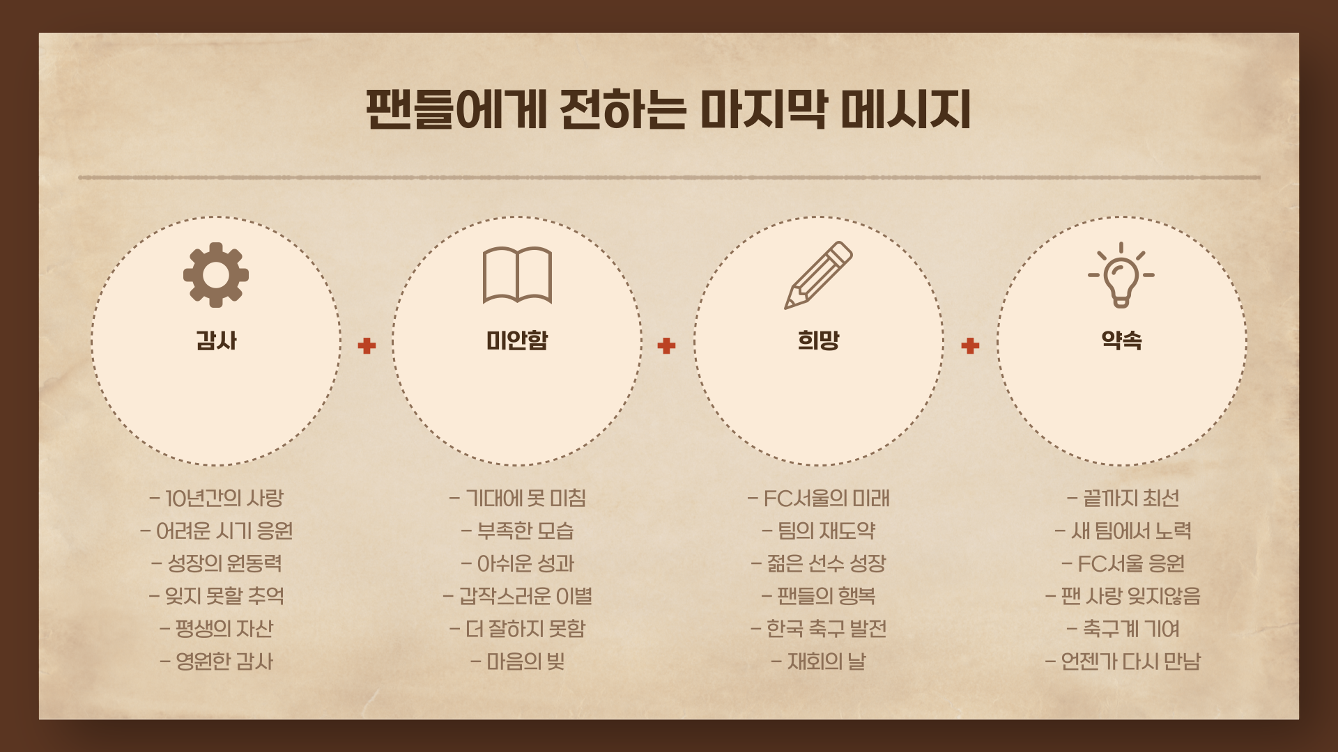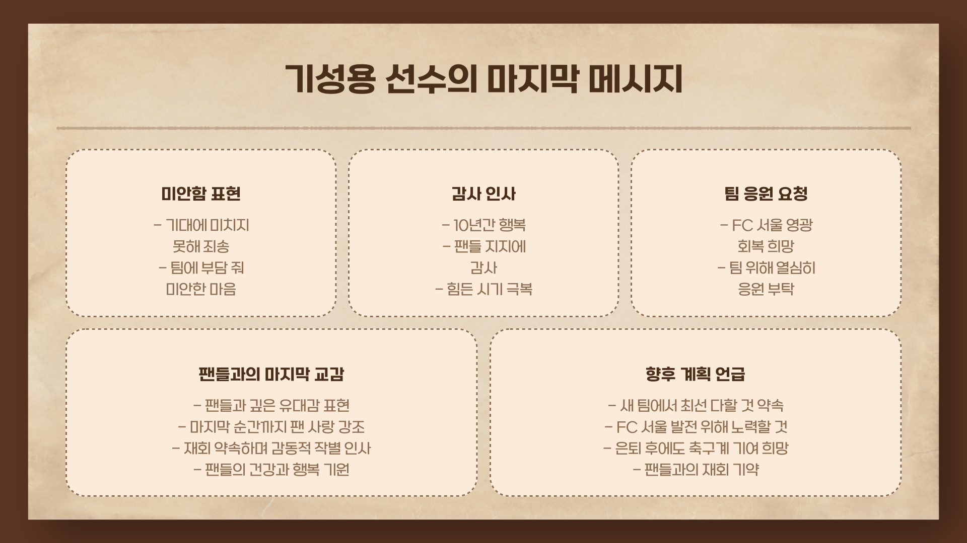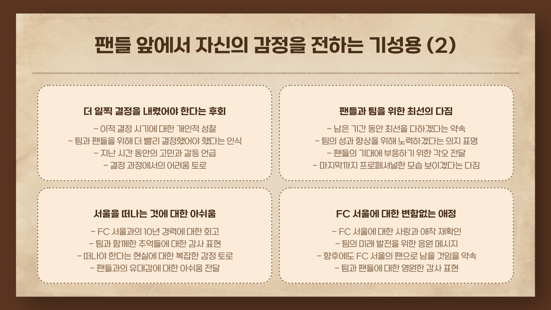 "FC서울 외에는 한 번도 다른 팀을 생각한 적 없다"는 고백이 팬들의 마음에 깊이 남았습니다.