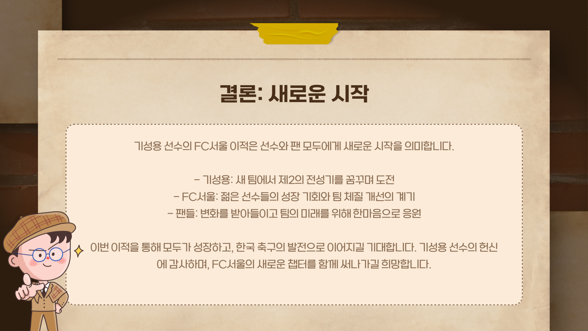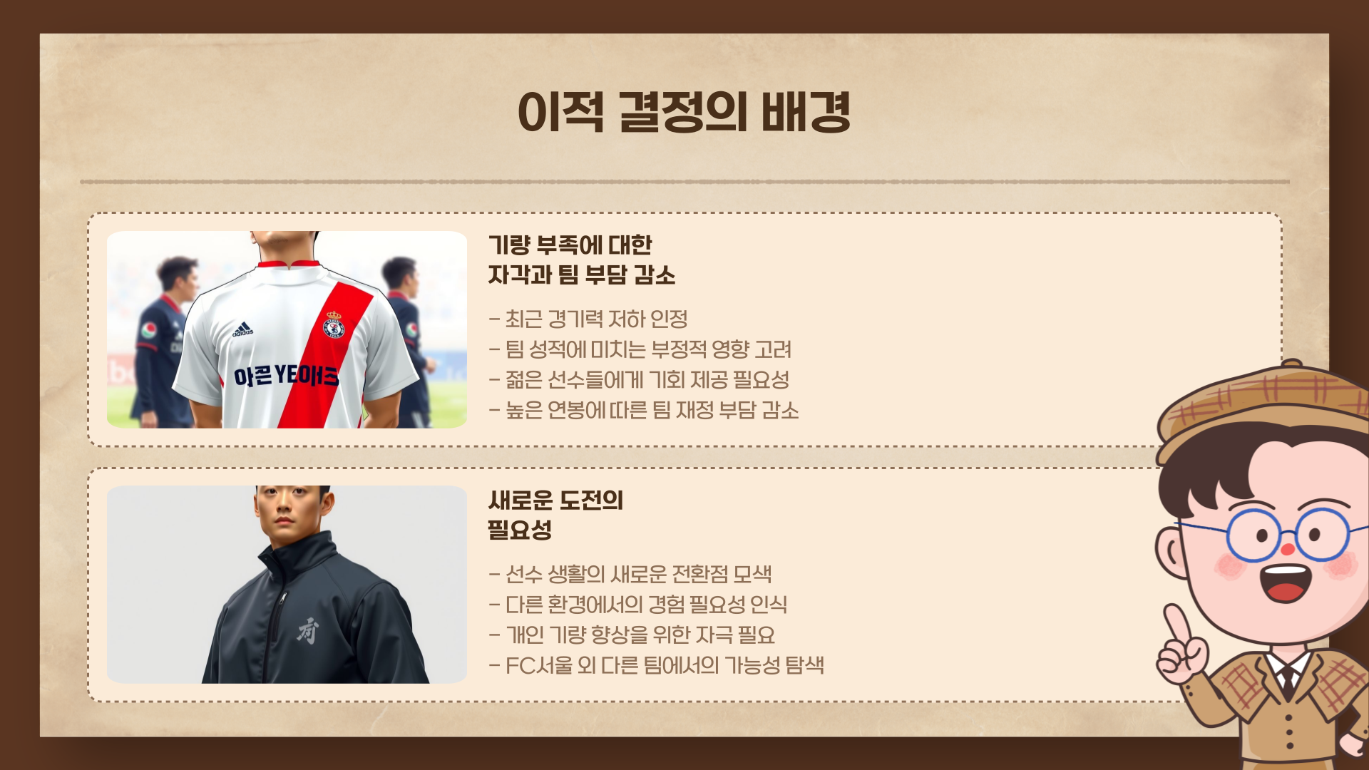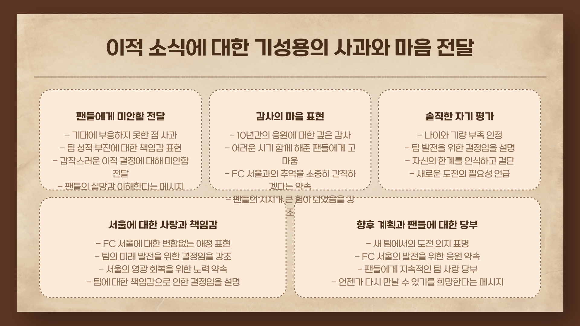 기성용 선수는 마지막 인사를 통해 자신의 이적이 누구의 탓도 아니며, 스스로의 부족함이 원인일 수 있다고 말했습니다. 팬들 입장에서는 이해하기 어려운 선택일 수도 있었지만, 그의 말에서 느껴지는 진심은 꽤 무게감 있었습니다. 그는 “더 이상 팀이 나로 인해 흔들리지 않길 바란다”며 팀을 위한 선택임을 분명히 했죠. 그리고 그 말에는 후회보다는 책임감이 더 크게 느껴졌습니다.