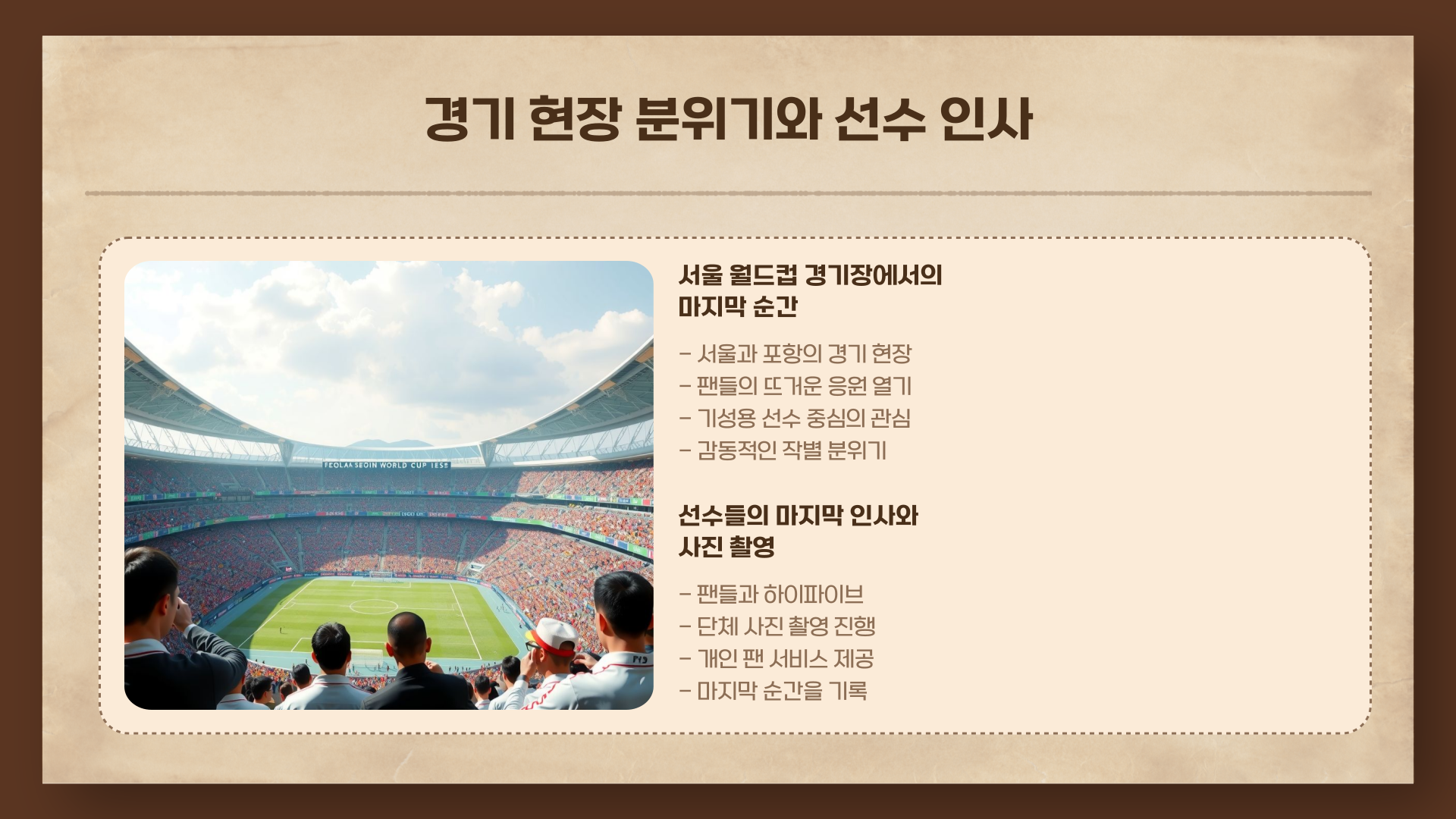 서울 월드컵 경기장에서 열린 FC서울과 포항의 경기. 경기가 끝난 후의 풍경은 단순한 승패를 넘어선 감정의 교차점이었어요. 특히 기성용 선수의 마지막 인사는 많은 이들의 시선을 사로잡았죠. 선수들이 그라운드에서 팬들과 눈을 마주치며 인사하고, 사진 촬영을 하며 작별을 고하는 장면은 말 그대로 ‘축구 그 이상의 순간’이었습니다. 그날의 하늘조차 왠지 흐렸던 것 같아요. 감정을 덮는 듯한 그런 날씨였죠.