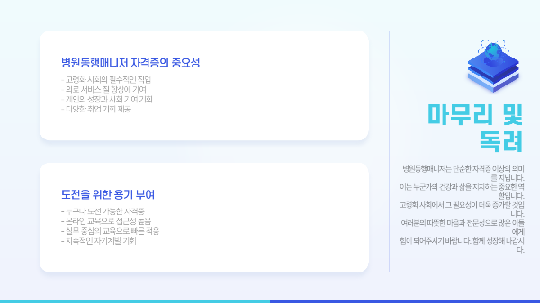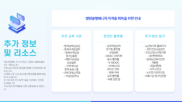 여기까지 읽어주셔서 감사합니다! 병원동행매니저 자격증은 단순한 자격을 넘어서, 누군가의 건강과 삶을 지지하는 따뜻한 역할이에요. 저처럼 가족의 병원 방문을 걱정해본 적이 있다면, 혹은 새로운 경력을 쌓고 싶은 분이라면 지금이 시작할 기회입니다. 이 글이 여러분의 작은 용기가 되어드렸다면 더 바랄 게 없겠네요. 궁금하신 점이나 공유하고 싶은 경험이 있다면 댓글로 나눠주세요. 함께 이야기 나눠봐요!