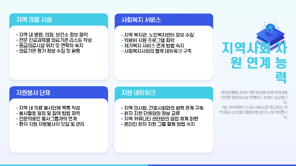 병원 내 케어 코디네이터, 요양원 병원동행, 복지관 어르신 지원 등으로 일할 수 있어요.