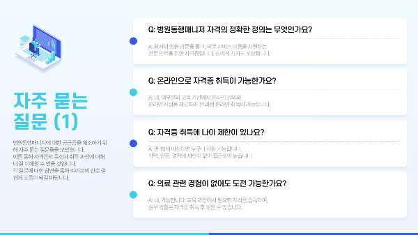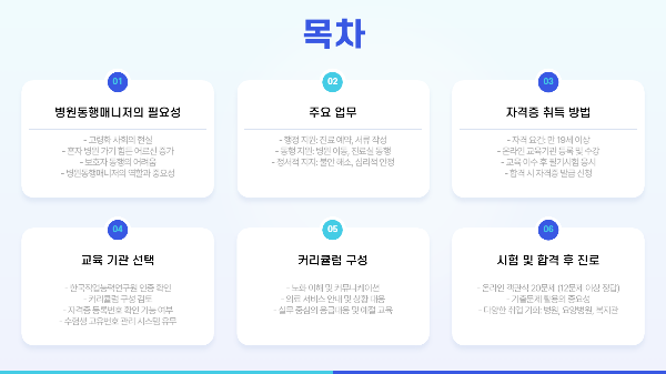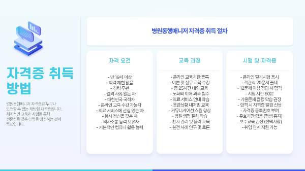 병원동행매니저 자격증은 특별한 조건 없이 누구나 도전할 수 있는 점이 매력적이에요. 만 19세 이상이면 학력, 경력 무관하게 응시할 수 있답니다. 요즘엔 온라인으로도 교육과 시험을 모두 진행할 수 있어서 시간 제약 없이 공부할 수 있다는 것도 큰 장점이죠.