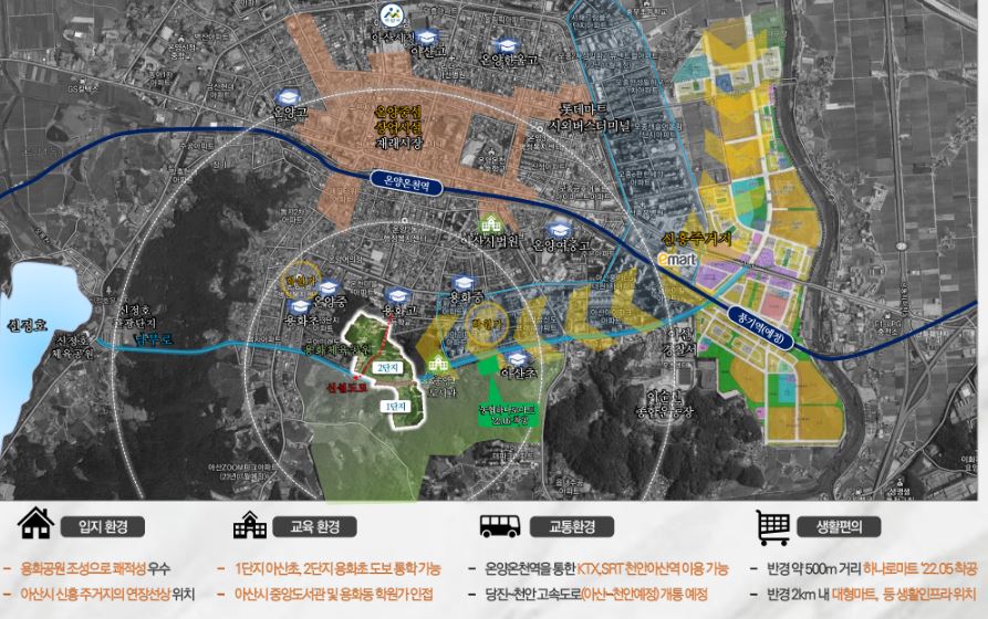 입지적으로도 매우 주목받는 위치예요. 교통과 생활 편의시설이 모두 가까운 곳에 위치해 있어, 일상에서의 만족감이 상당히 높습니다. 이마트 트레이더스, 갤러리아백화점, 아산터미널, 온양온천지구 등은 이미 정착된 생활 중심지이고, 앞으로 용화지구 개발이 본격화되면 더 많은 혜택이 쏟아지겠죠.