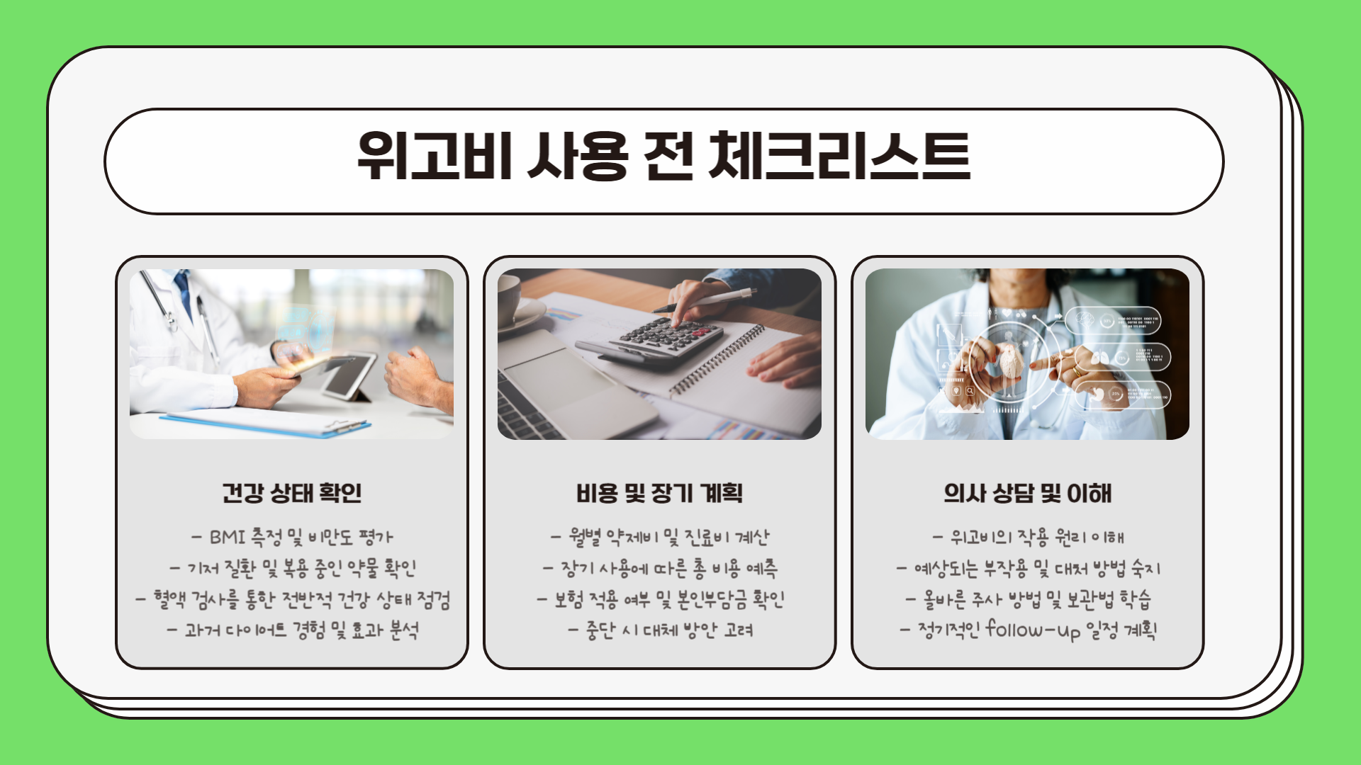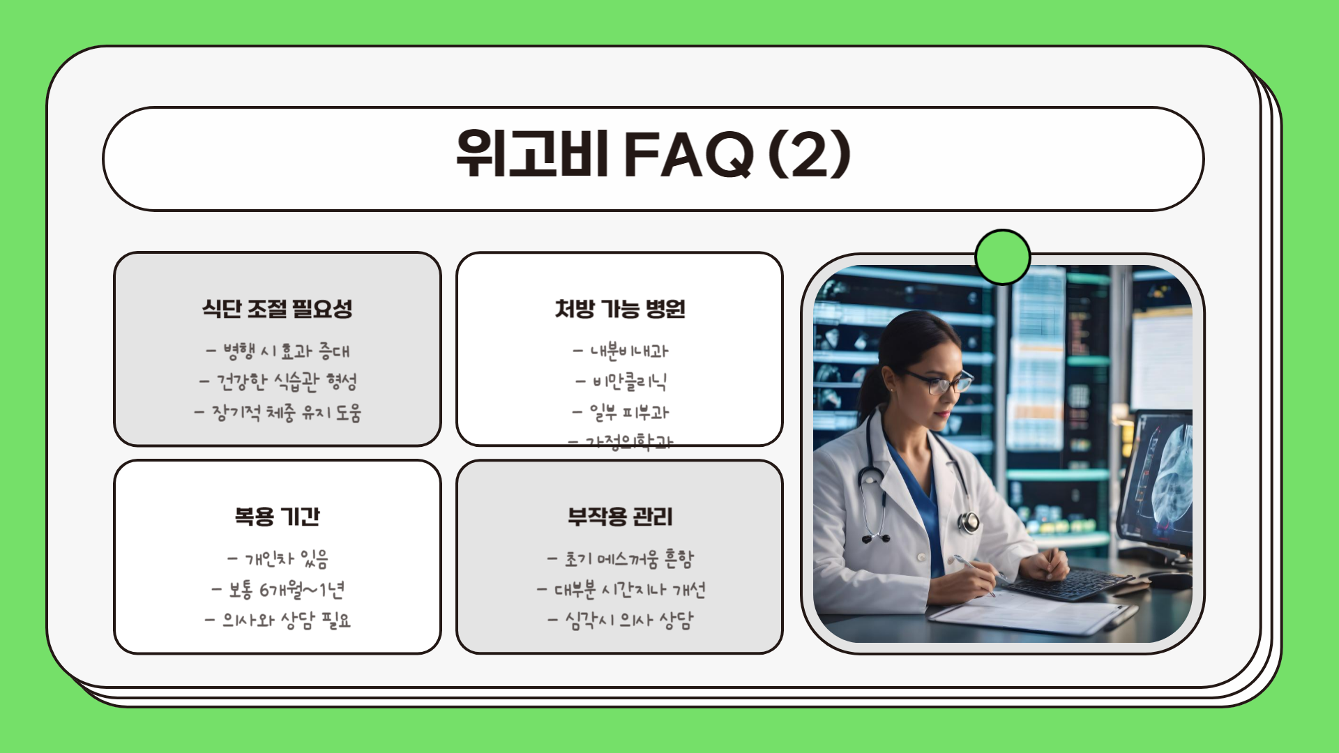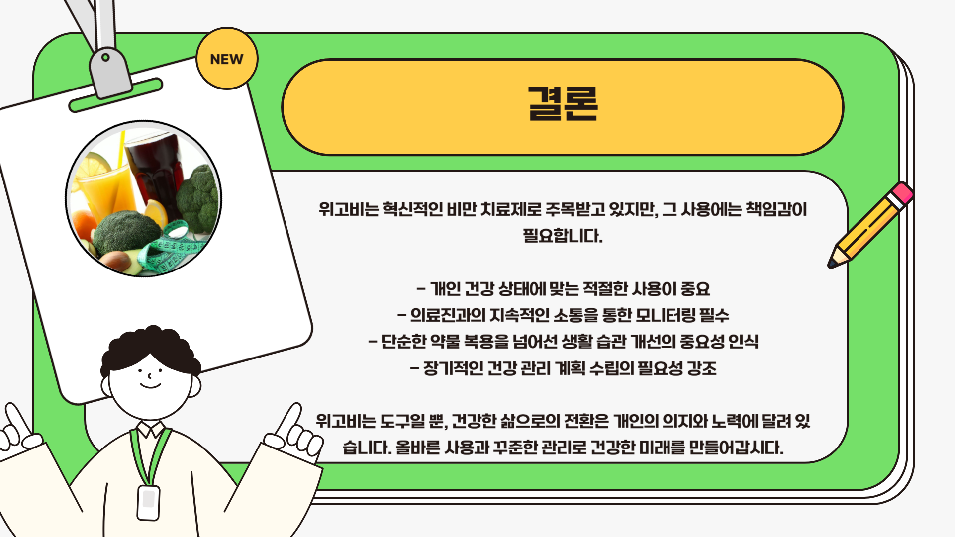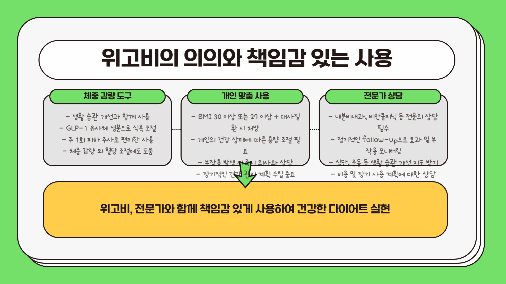 위고비는 단순한 다이어트가 아니라 생활 습관까지 함께 바꿔주는 체중 감량 도구입니다. 하지만 그만큼 책임감 있게 접근해야 하는 약이기도 해요. 여러분의 몸과 건강에 맞는 방법인지 꼼꼼히 확인하고, 믿을 수 있는 병원에서 상담받으세요. 위고비, 올바르게 사용한다면 분명 멋진 결과를 가져올 수 있어요. 궁금하신 점은 언제든 댓글로 남겨주세요!