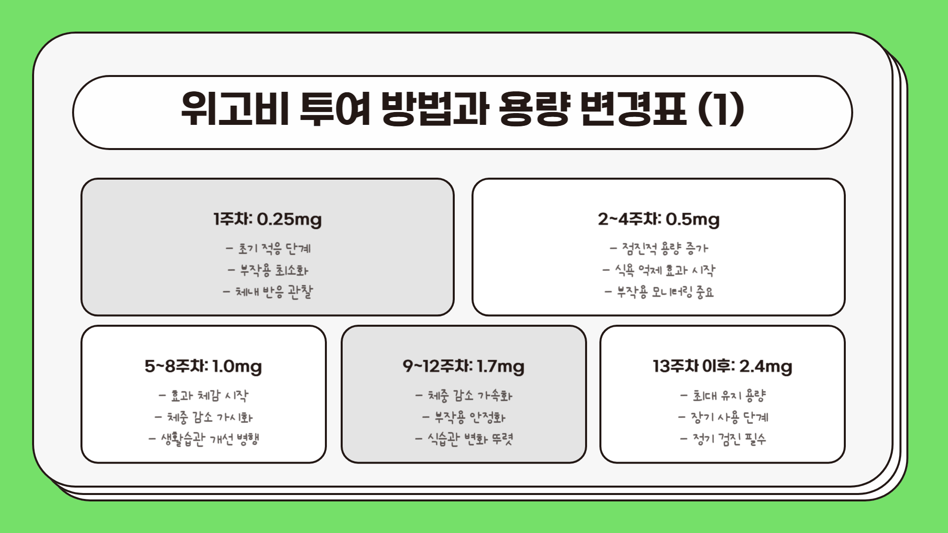 위고비는 체내 적응을 위해 용량을 점진적으로 증량하는 것이 특징입니다. 초기부터 고용량을 투여할 경우 부작용이 심해질 수 있기 때문에, 아래의 단계에 따라 조절합니다.