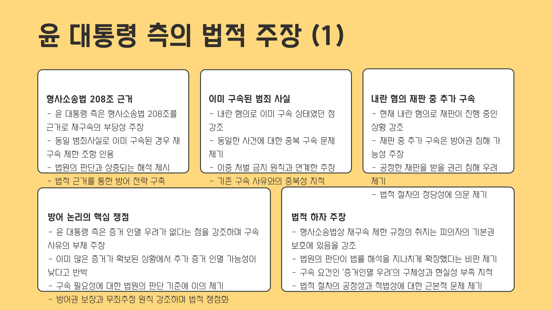 윤 전 대통령 측은 현 상황에 대해 명확한 법리적 반론을 제기하고 있습니다. 이미 내란 혐의로 재판이 진행 중인 만큼, 같은 사건에 대해 또다시 신병을 확보하는 것은 위법하다는 것이죠. 형사소송법 제208조를 근거로 중복 구속은 허용될 수 없다고 강조하고 있어요. 그러나 법원은 "이 사안은 새로운 혐의와 증거 인멸 가능성을 포함한 별개의 사안으로 볼 수 있다"고 판단해 구속을 유지했습니다.