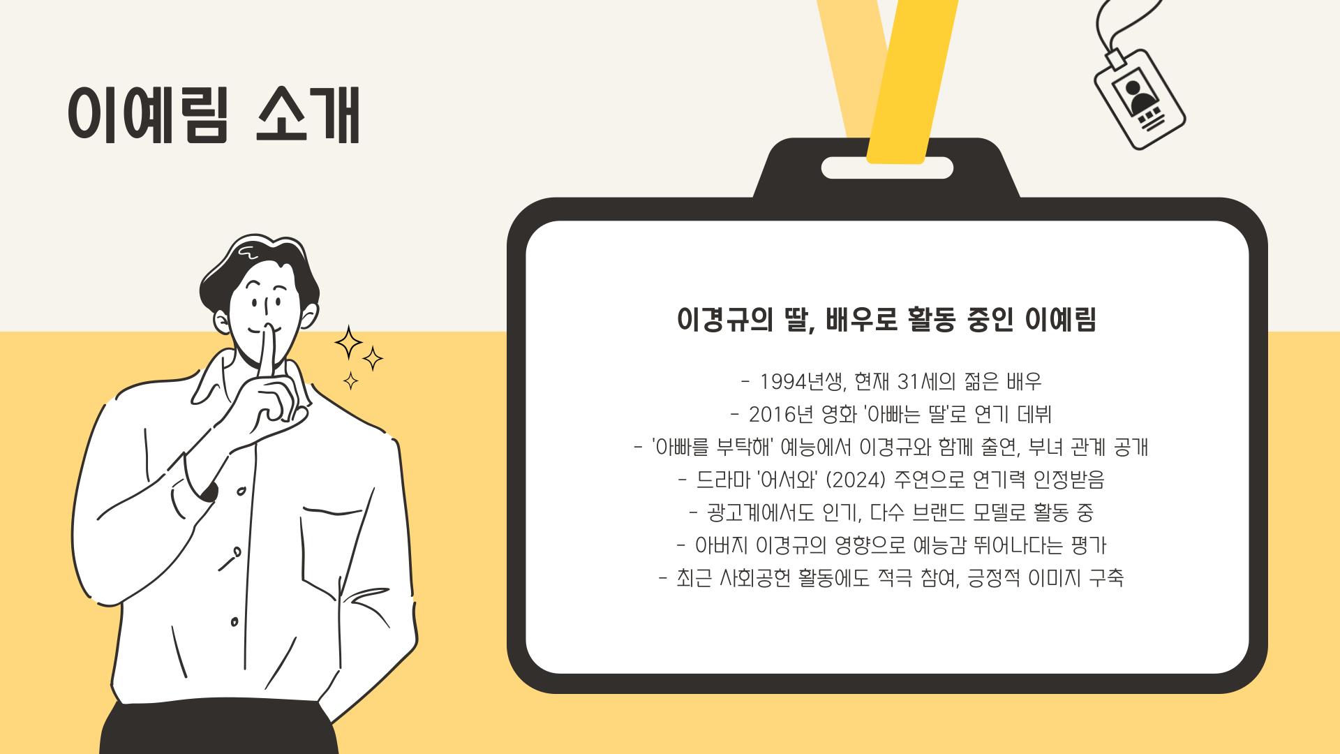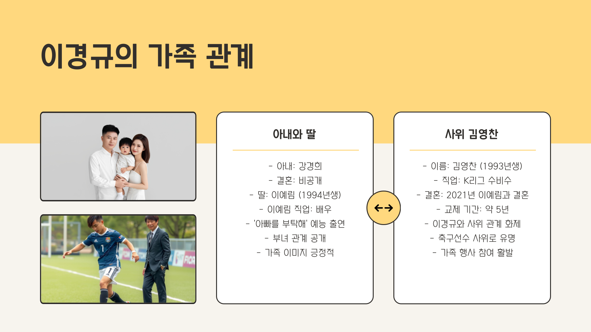 이경규의 딸 이예림은 1994년생으로, 배우로 활동 중입니다. 두 사람은 '아빠를 부탁해'를 통해 함께 예능에 출연하며 깊은 부녀 관계를 보여줬죠. 2021년, 그녀는 축구선수 김영찬과 결혼하며 ‘축구선수 사위’를 두게 되었습니다.