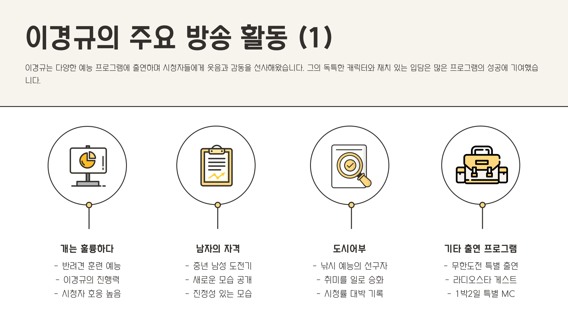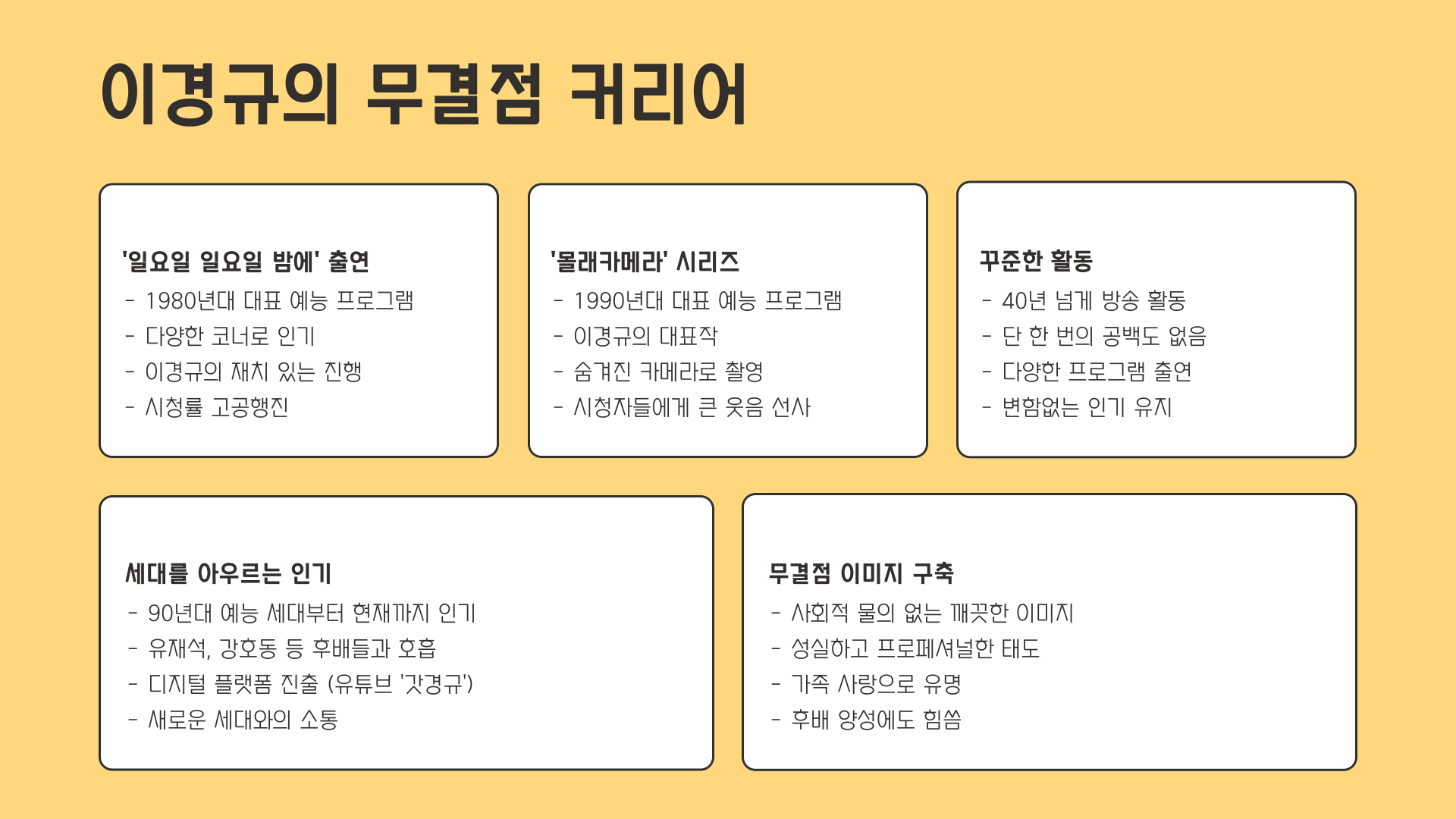 '개는 훌륭하다', '남자의 자격', '도시어부' 등 이경규가 출연한 프로그램은 셀 수 없이 많습니다. 특히 ‘몰래카메라’ 시리즈는 예능사에 길이 남을 전설적인 콘텐츠로 평가받고 있죠. 그는 유재석, 강호동, 김종국 같은 후배들과도 호흡을 맞추며 자연스럽게 세대 교체를 이끌었습니다. 최근에는 유튜브 채널 '갓경규'로 디지털 플랫폼에서도 활동 중이며, 후배들과의 콜라보로 또 다른 전성기를 누리고 있습니다.