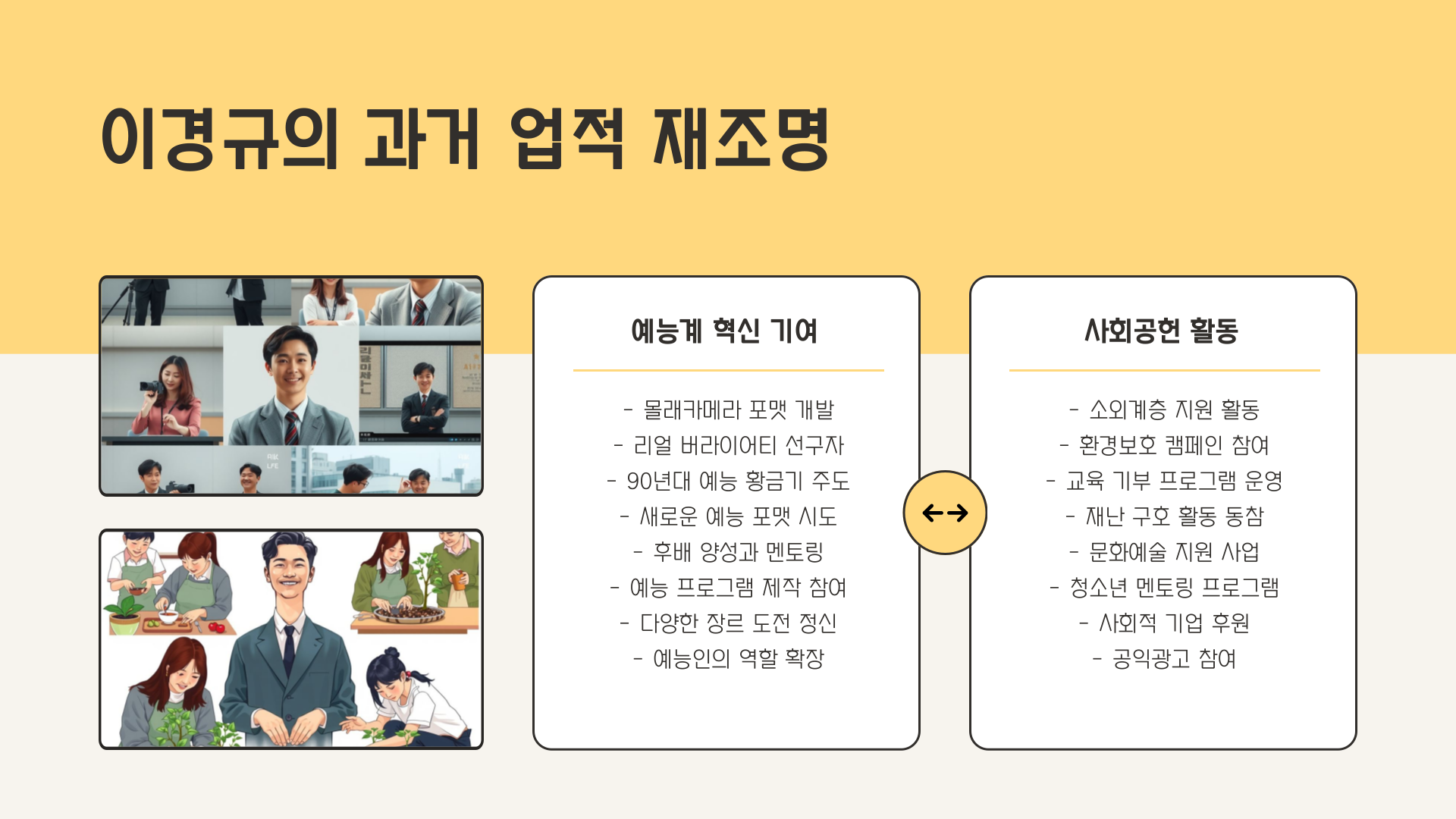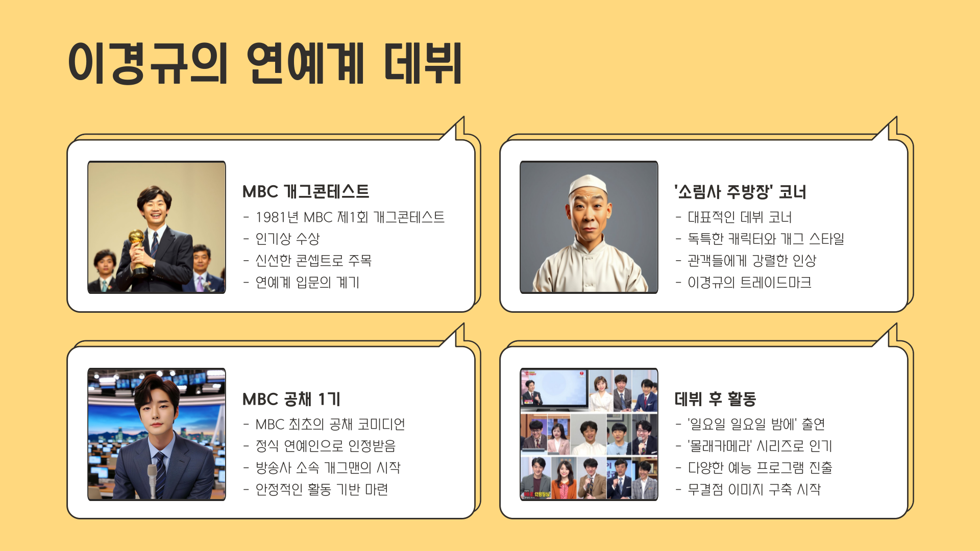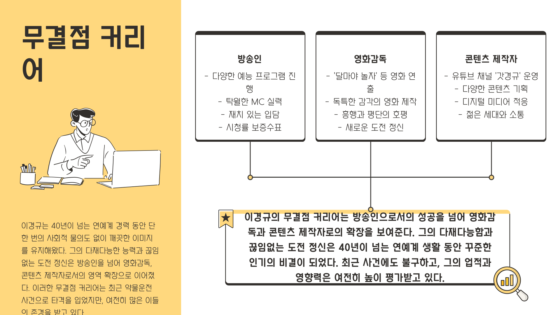 1981년 MBC 제1회 개그콘테스트에서 '소림사 주방장' 코너로 인기상을 받으며 연예계에 입문한 이경규. 당시만 해도 신선한 콘셉트와 독특한 개그로 강렬한 인상을 남겼고, 이후 '일요일 일요일 밤에', '몰래카메라' 같은 프로그램으로 국민적 인기를 얻습니다. 데뷔 후 단 한 번의 공백도 없이 꾸준히 활동을 이어왔고, 방송인, 영화감독, 콘텐츠 제작자로까지 영역을 확장했죠. 그의 커리어는 '무결점'이라는 말이 결코 과장이 아닙니다.