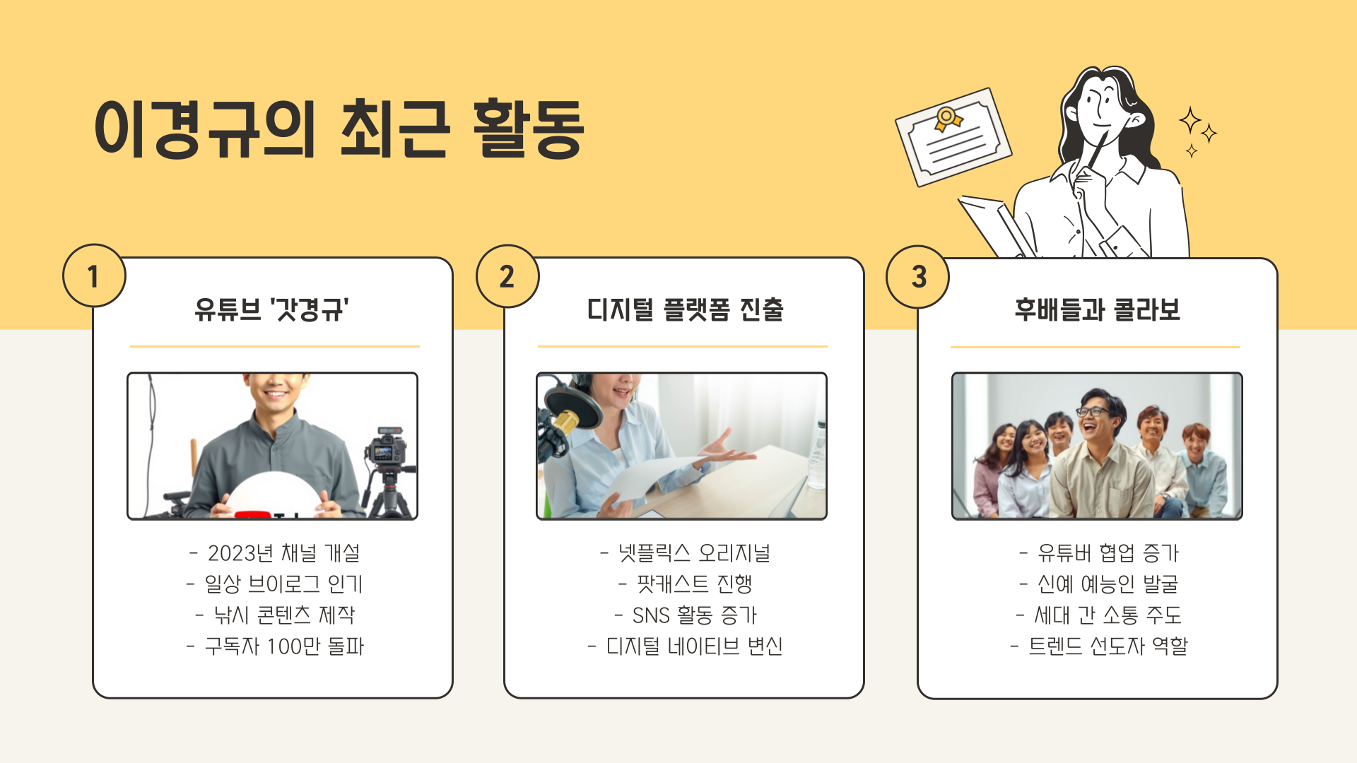 방송 활동 외에도 유튜브 ‘갓경규’를 운영 중이며, 영화 제작과 콘텐츠 개발에 참여하고 있습니다.