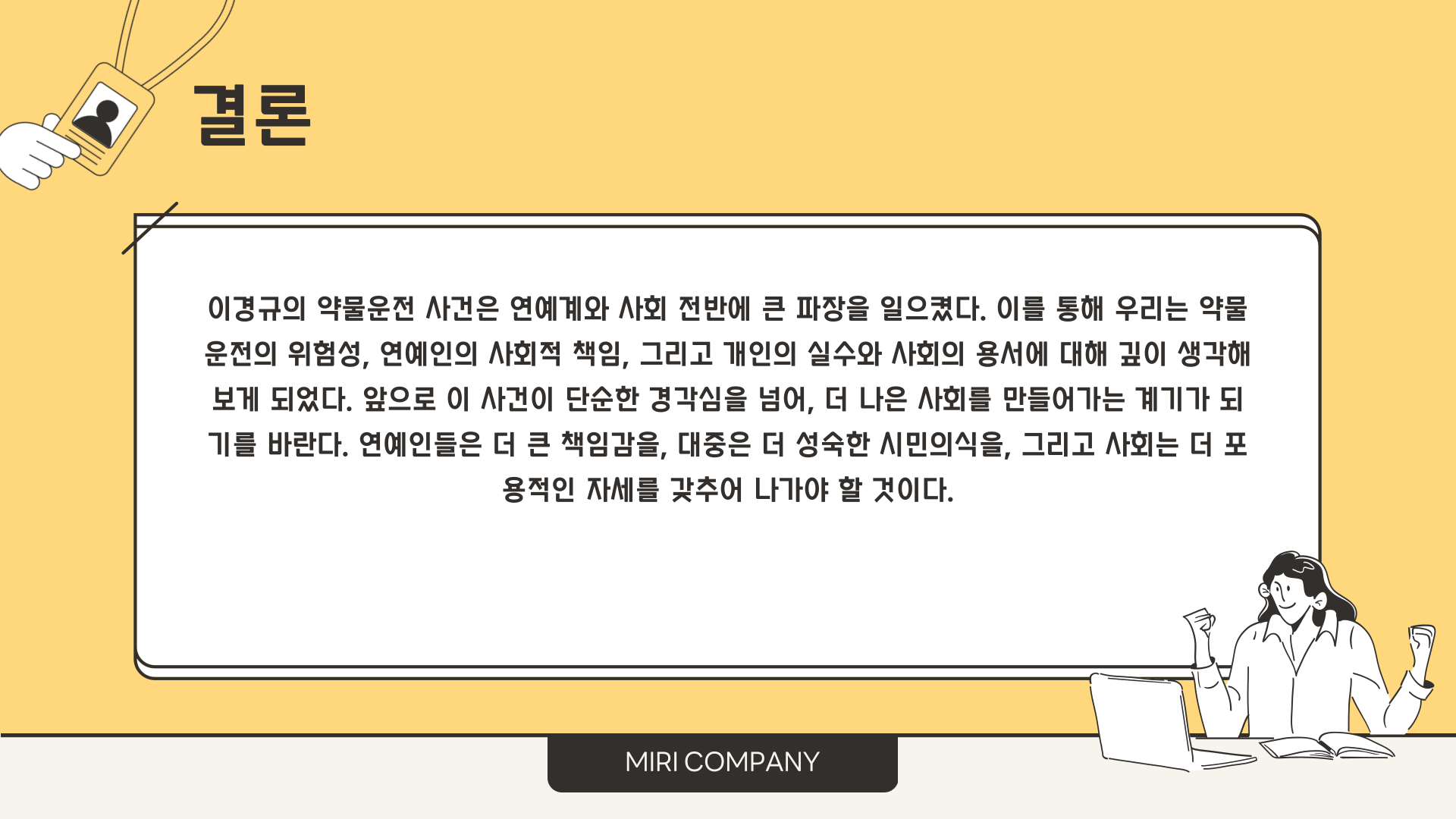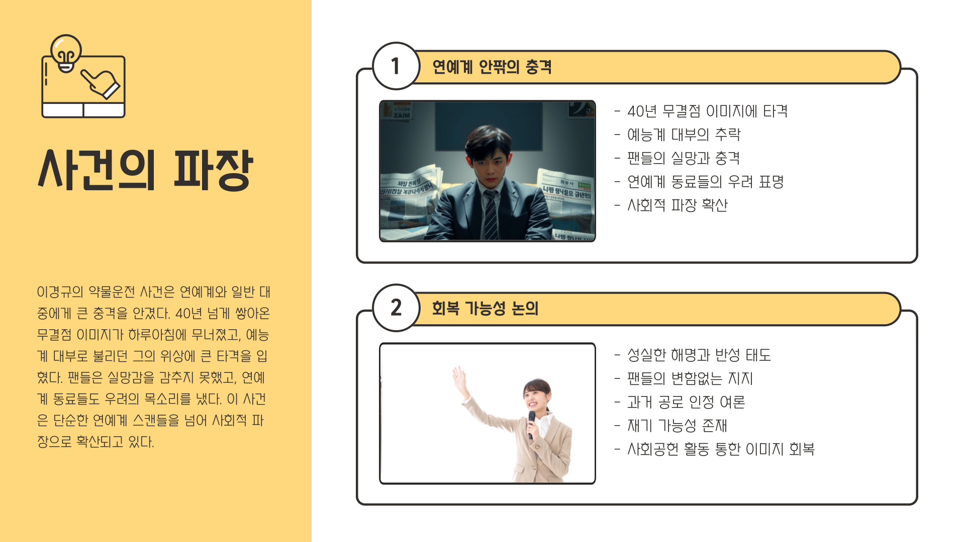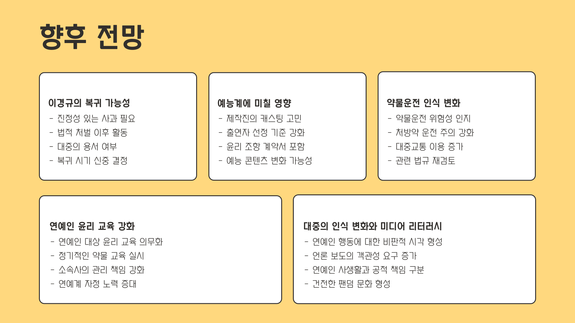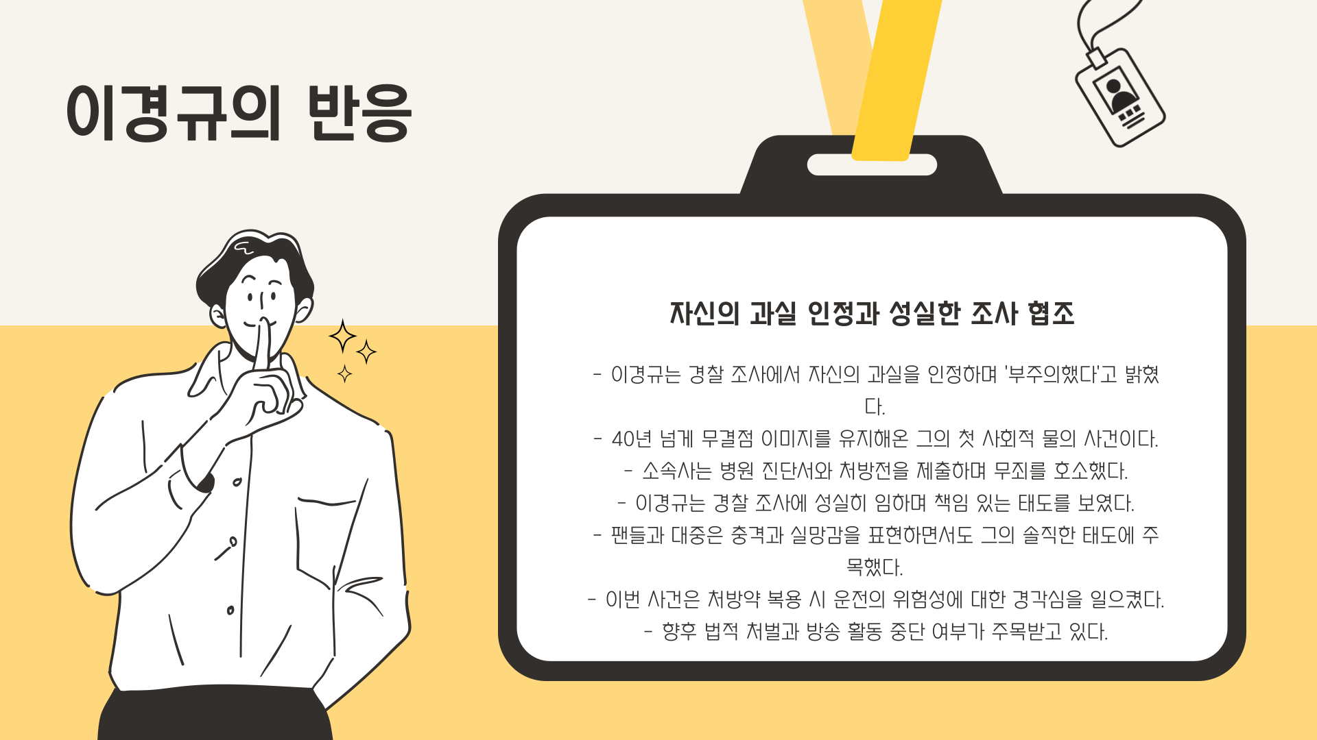 이경규 씨는 경찰 조사에서 자신의 과실을 인정하며 "부주의했다"고 밝혔습니다. 40년 넘게 단 한 번도 사회적 물의를 일으킨 적 없는 이경규의 이번 사건은 많은 이들에게 충격을 주었고, 연예계 안팎에서 큰 파장을 불러일으키고 있습니다.