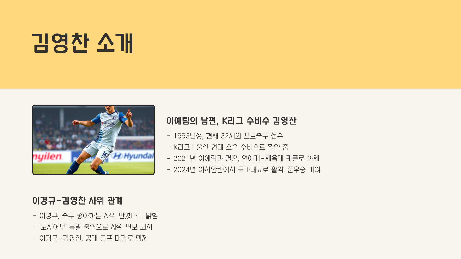 이예림은 배우로 활동 중이며, 김영찬은 K리그 수비수로 2021년에 결혼했습니다. 두 사람은 안정적인 가정을 이루고 있습니다.