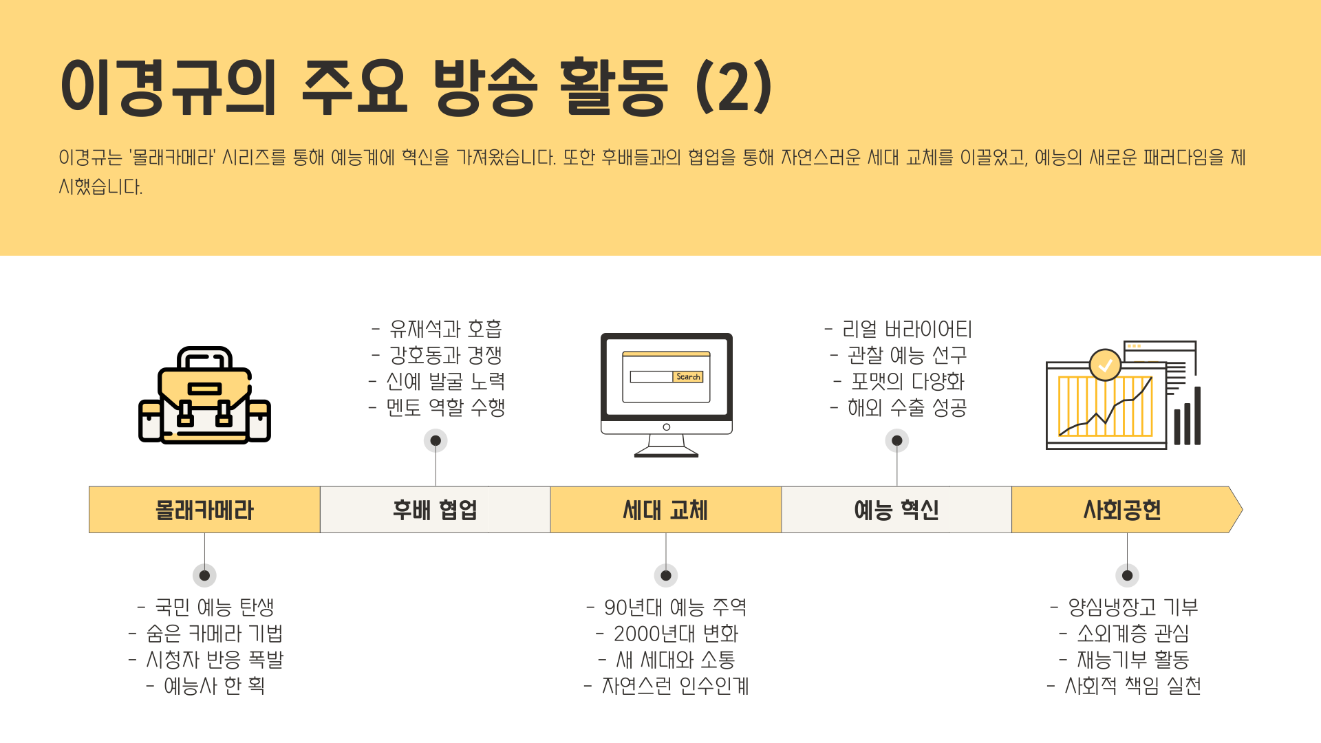 | 몰래카메라 | 연출, 출연 | 국민 예능 콘텐츠 |