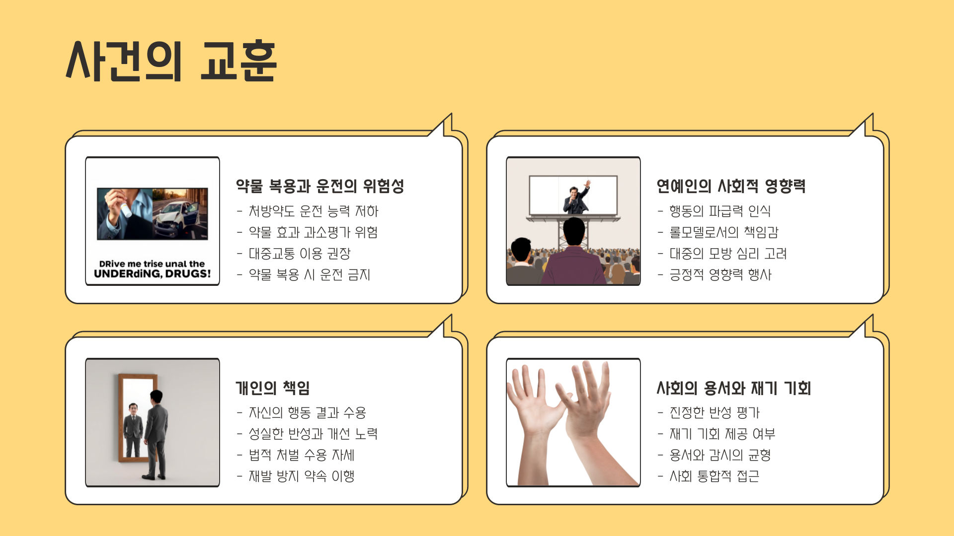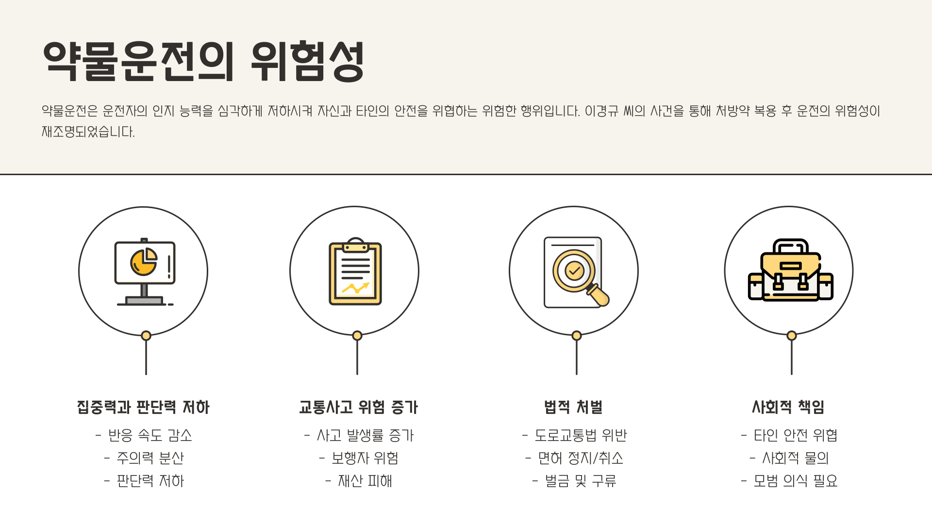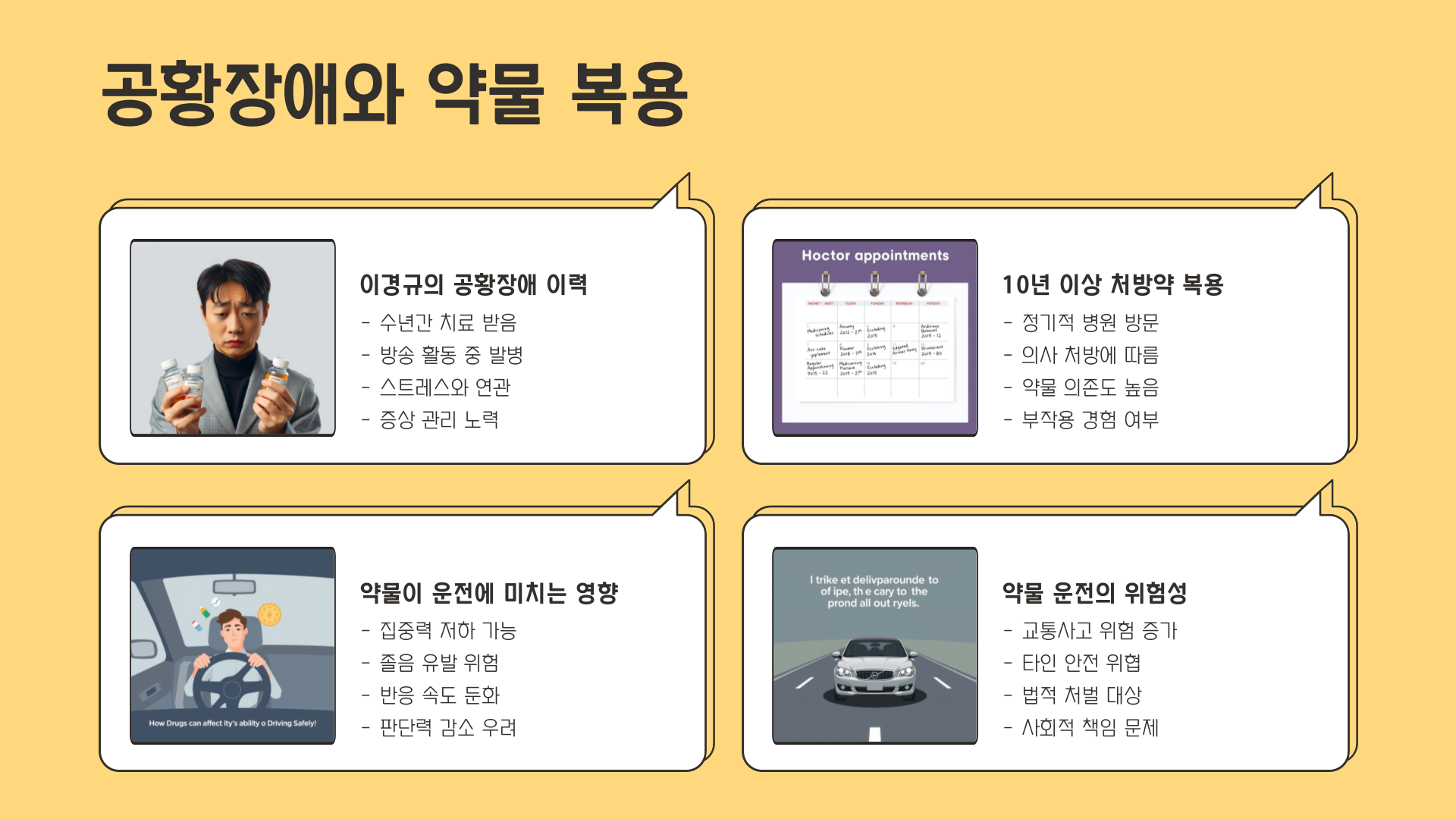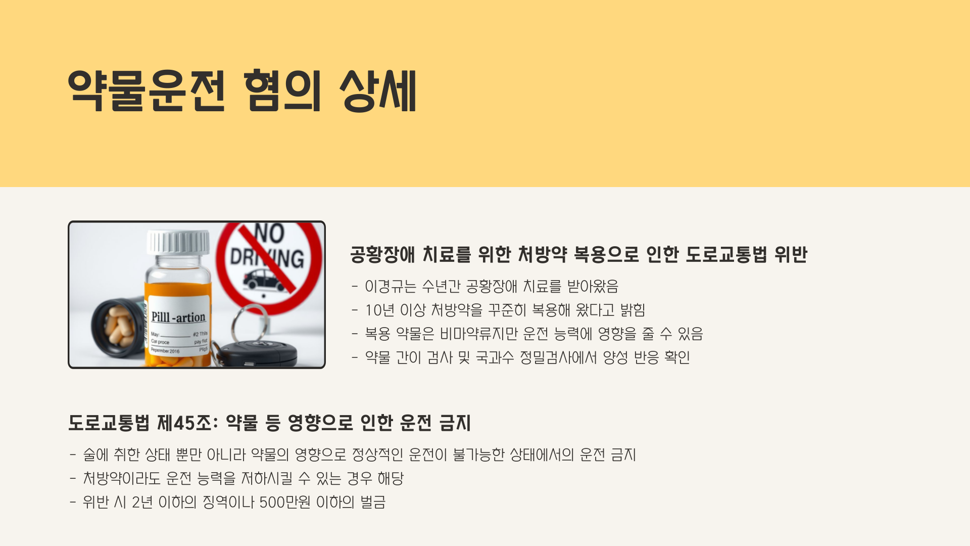 이경규 씨는 수년간 공황장애 치료를 받아왔으며, 10년 넘게 처방약을 꾸준히 복용해 왔다고 밝혔습니다. 문제는 이 약물이 집중력과 판단력에 영향을 줄 수 있다는 점인데요. 도로교통법 제45조는 약물의 종류와 상관없이 운전에 영향을 줄 수 있는 경우, 운전 자체를 금지하고 있습니다.