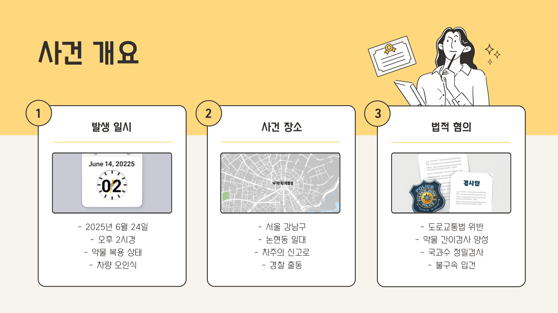 약물 복용 상태에서 차량을 잘못 인식하고 운전해 도로교통법 제45조 위반 혐의로 입건되었습니다.