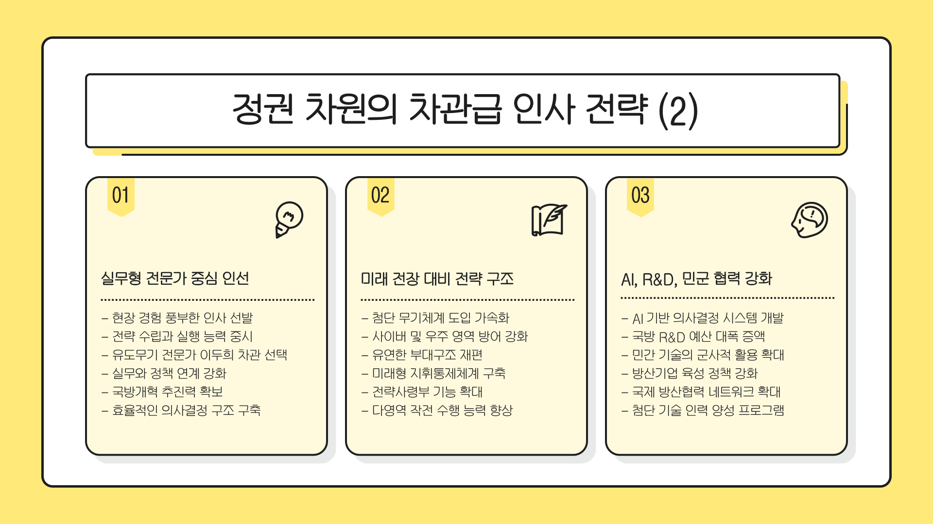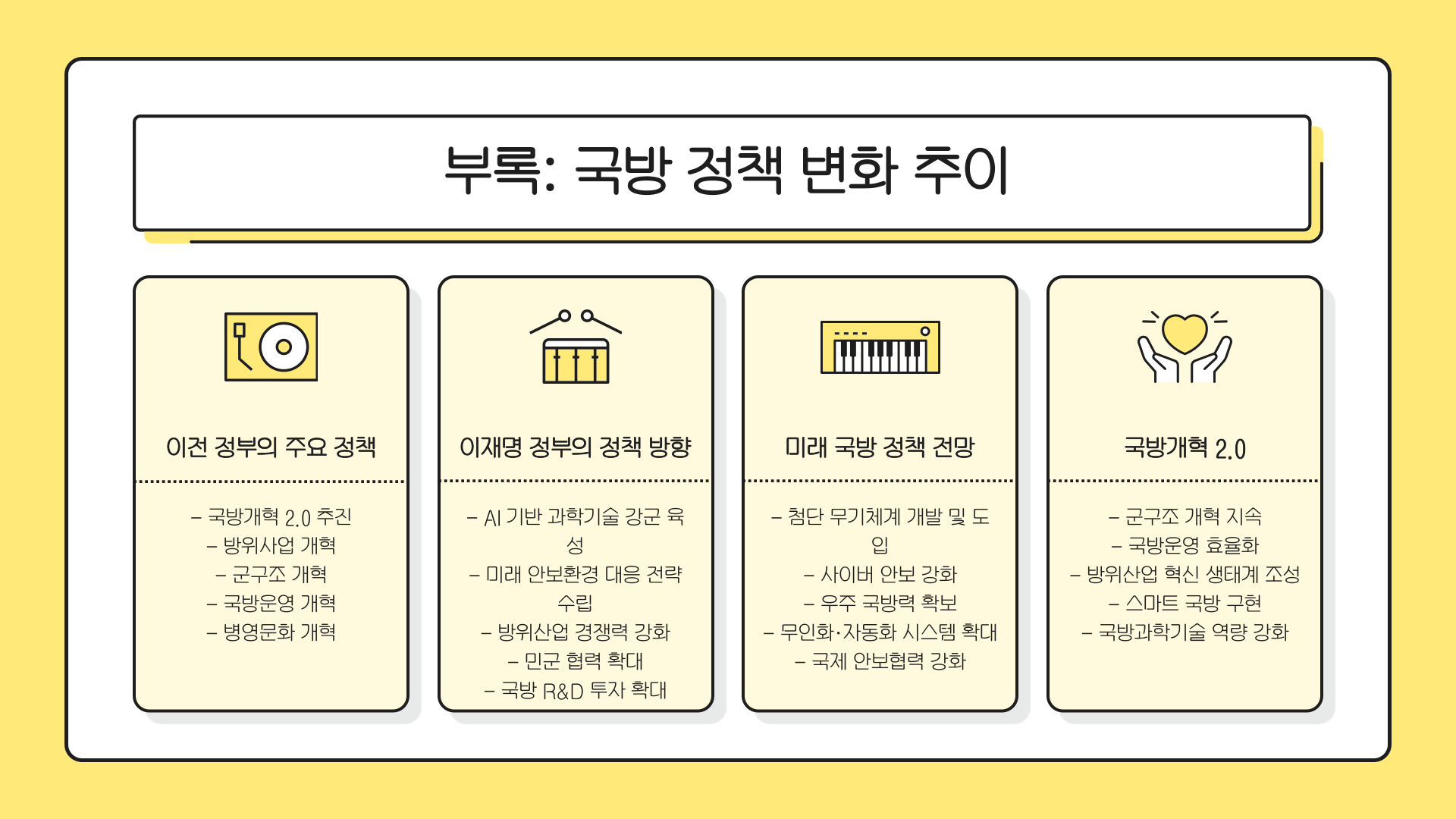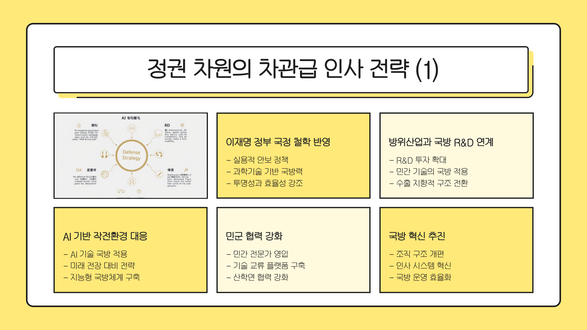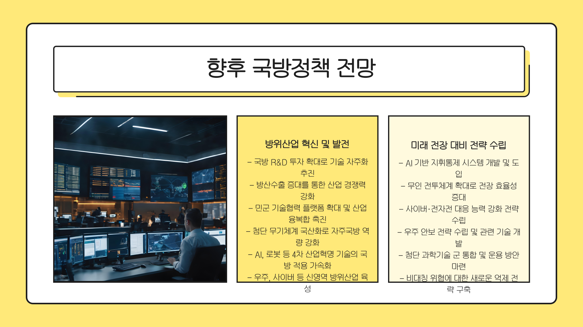 AI 전장 대응 전략, 민군 협력 R&D 확대, 방위산업 구조개혁 같은 변화 중심의 정책들이 추진될 가능성이 높습니다.