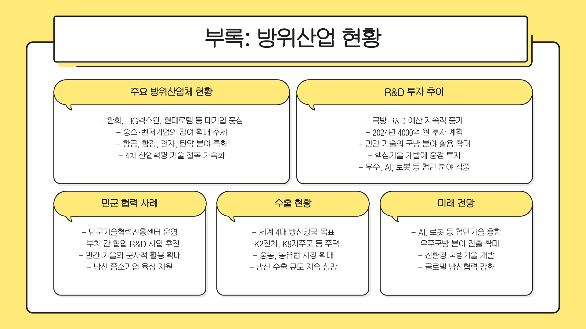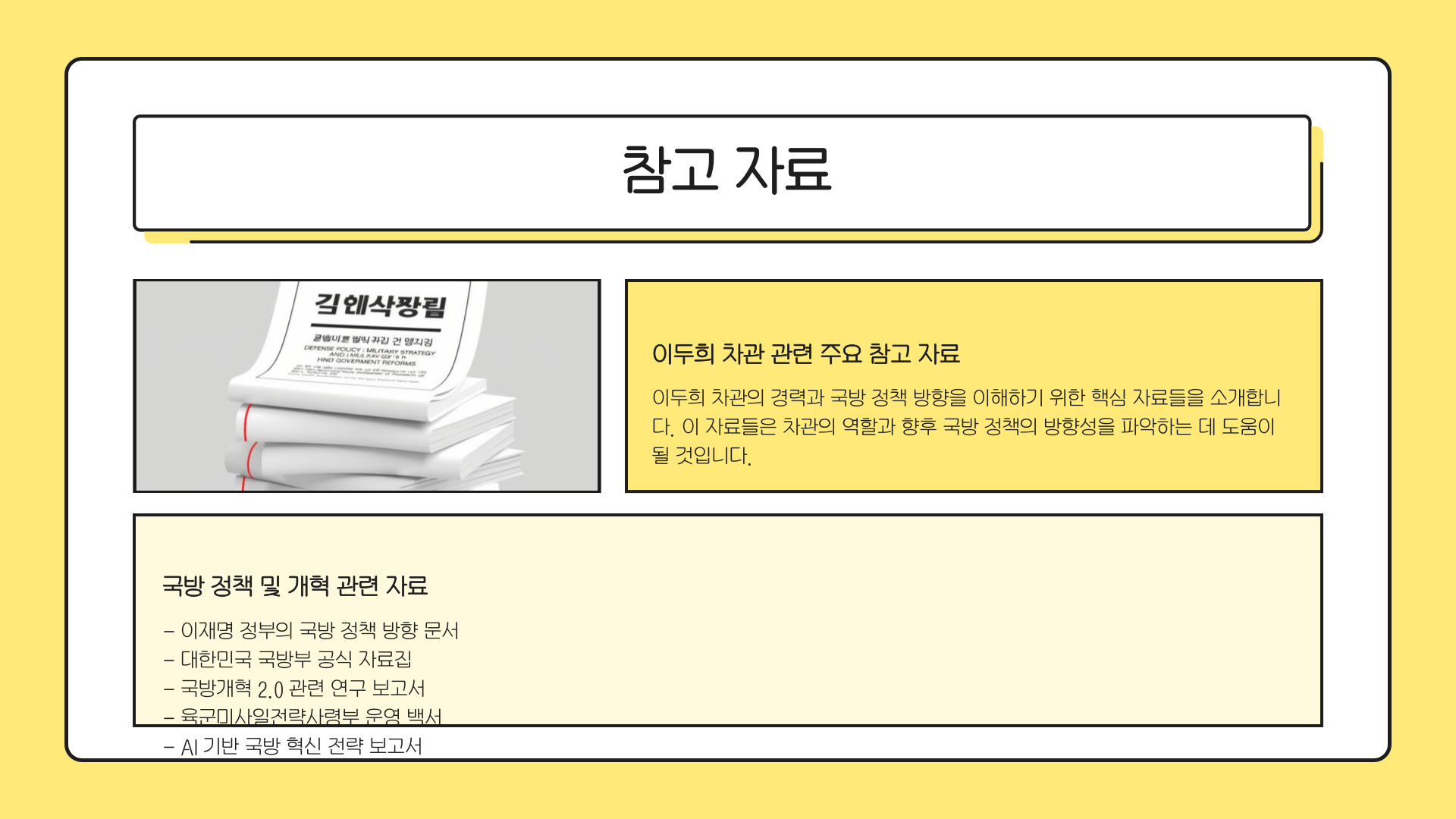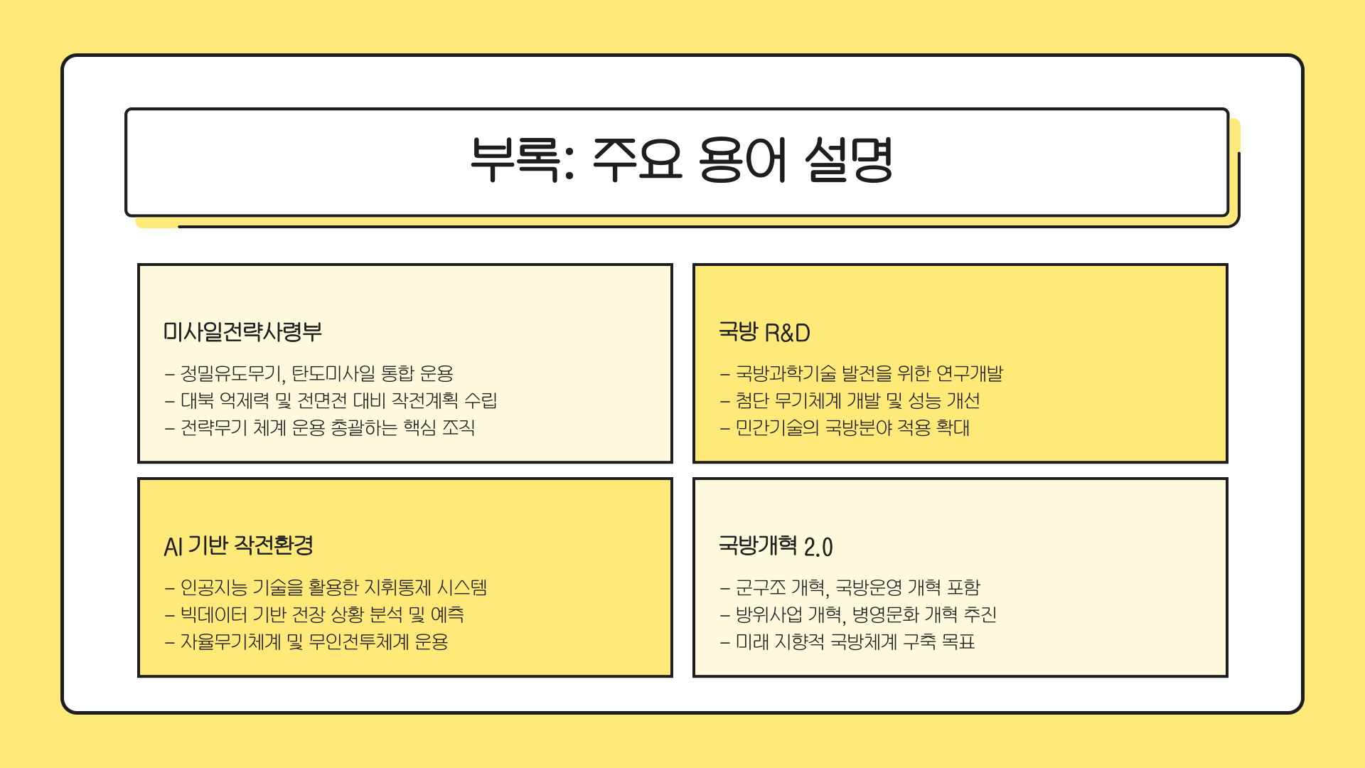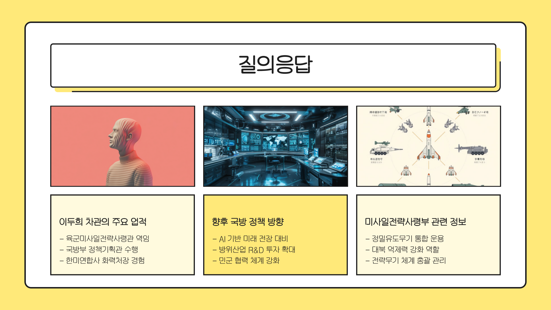 AI 전장 대응 전략, 민군 협력 R&D 확대, 방위산업 구조개혁 같은 변화 중심의 정책들이 추진될 가능성이 높습니다.