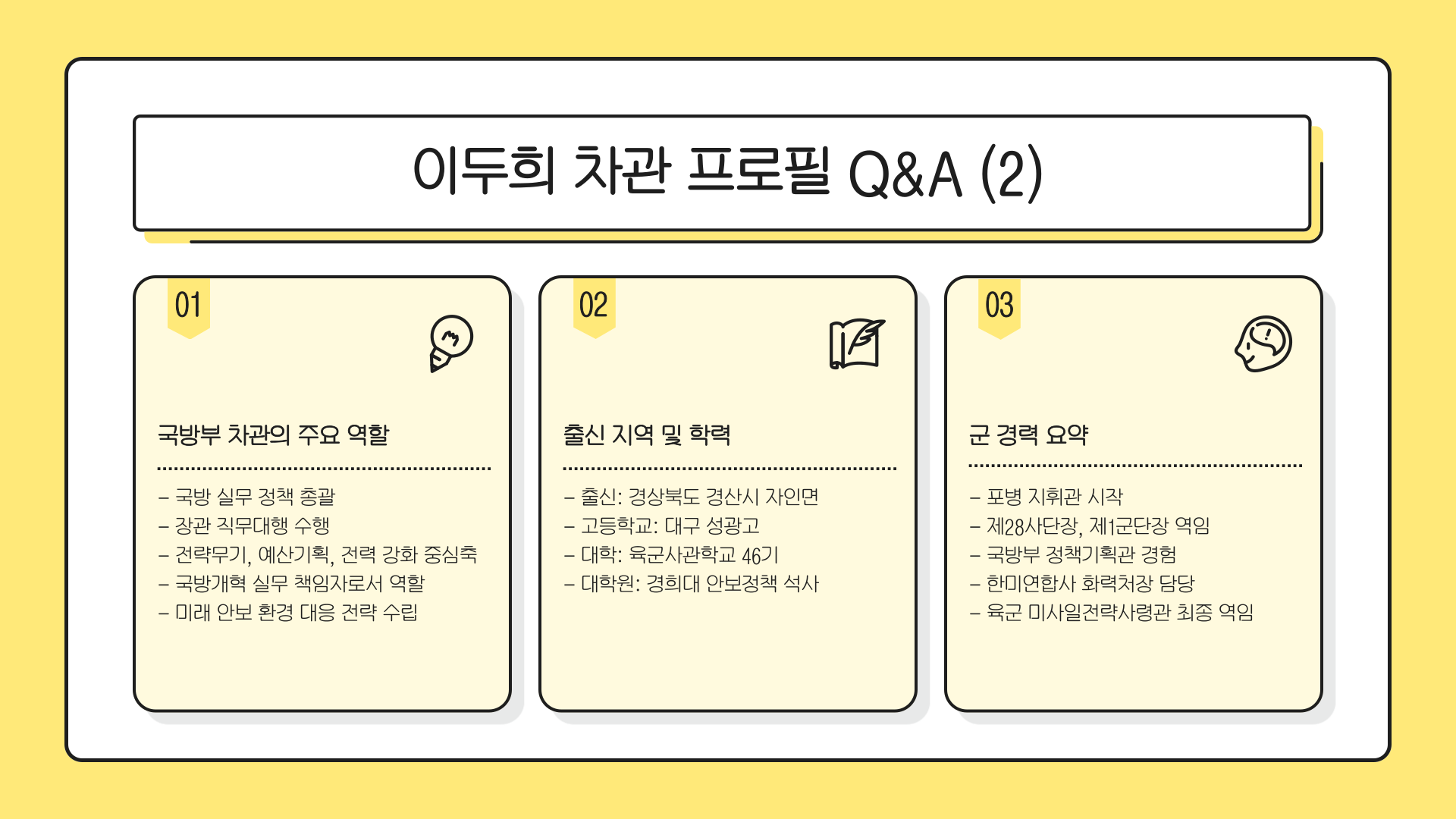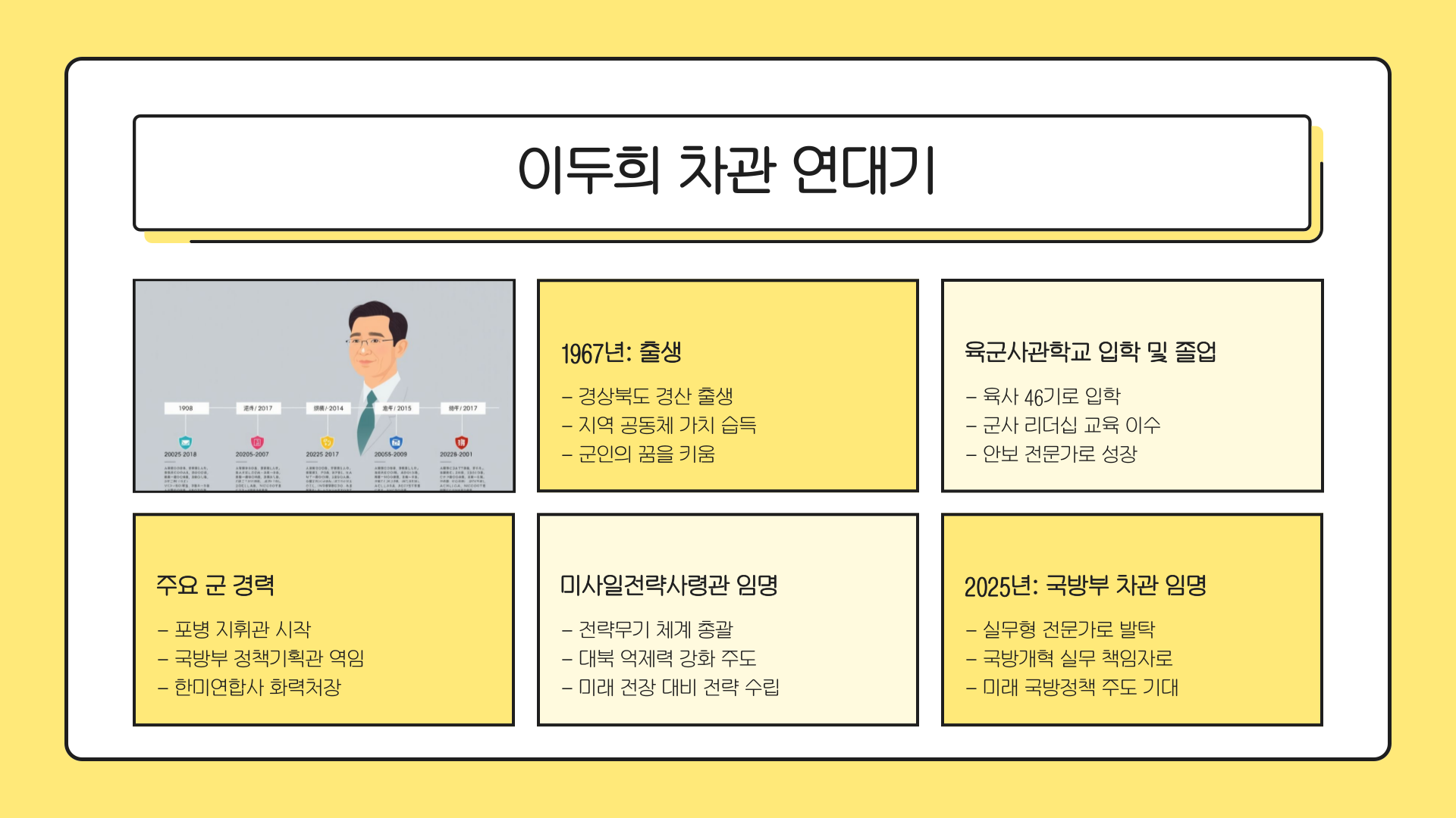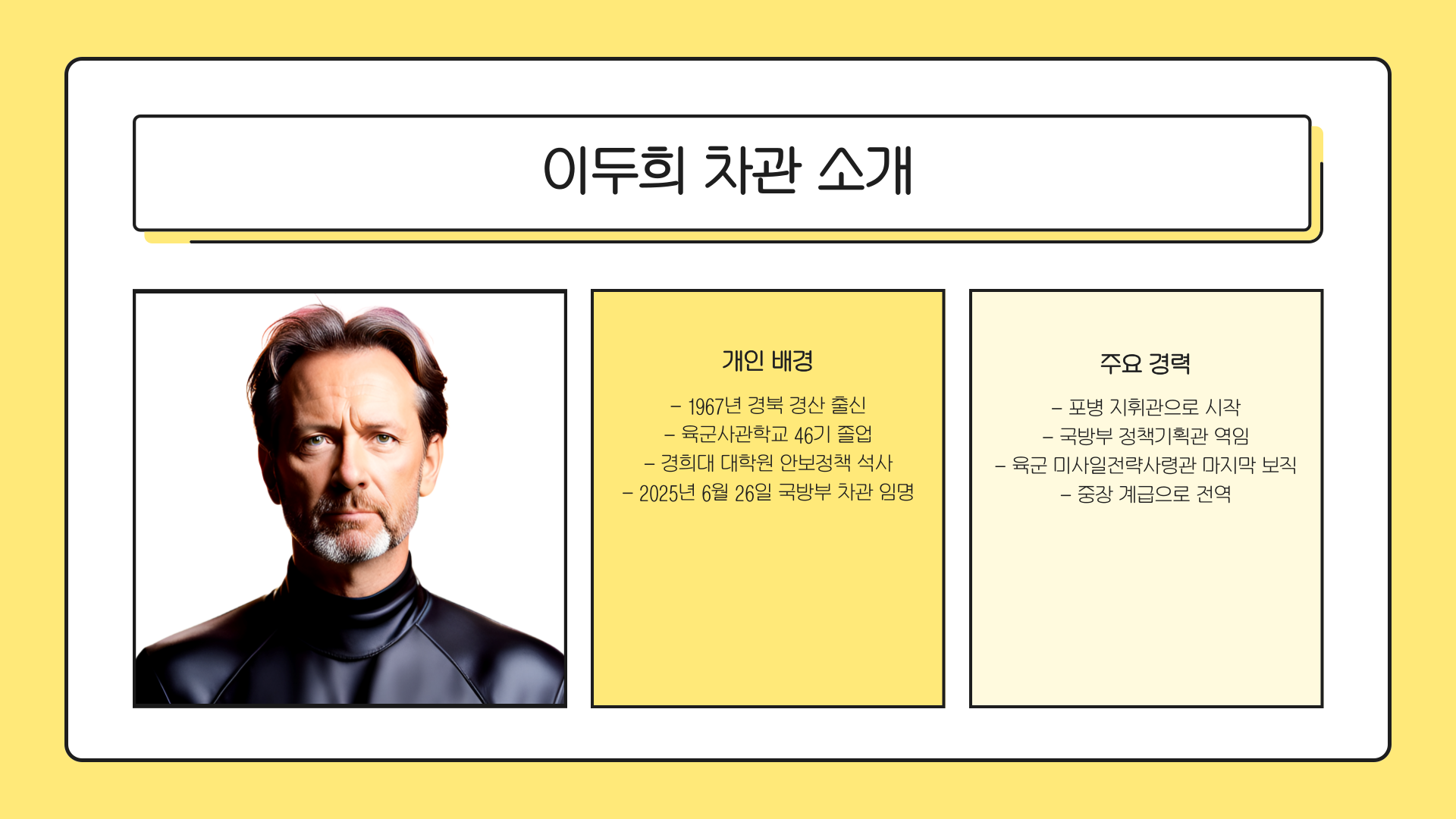 경북 경산 출신의 이두희 차관은 1967년생으로, 육군사관학교 46기 출신이며 경희대학교 대학원에서 안보정책 석사를 마쳤습니다. 군에서의 최종 계급은 중장으로, 포병 지휘관으로 시작해 전략기획을 아우르는 커리어를 쌓아왔죠. 그는 육군 미사일전략사령관이라는 특수 보직을 마지막으로 2025년 6월 26일 국방부 차관으로 임명됐습니다.