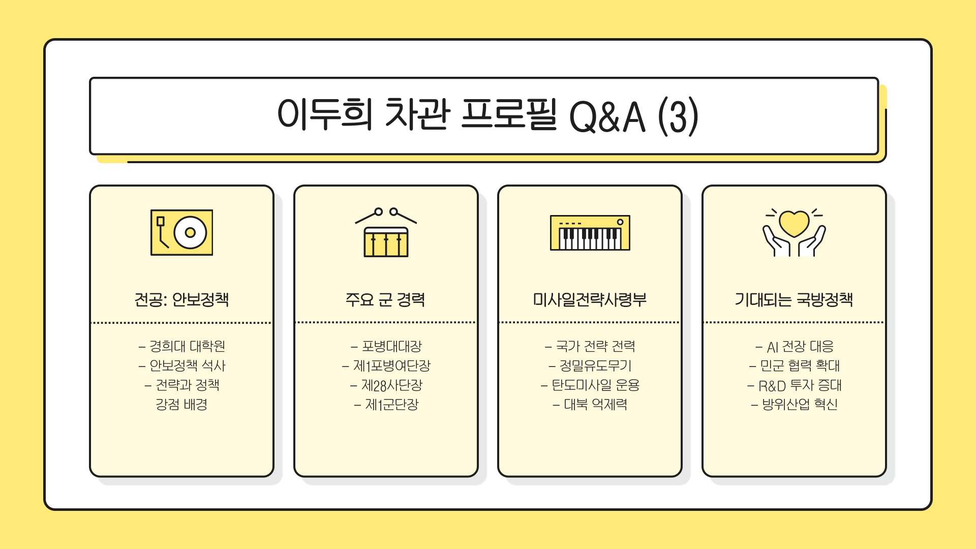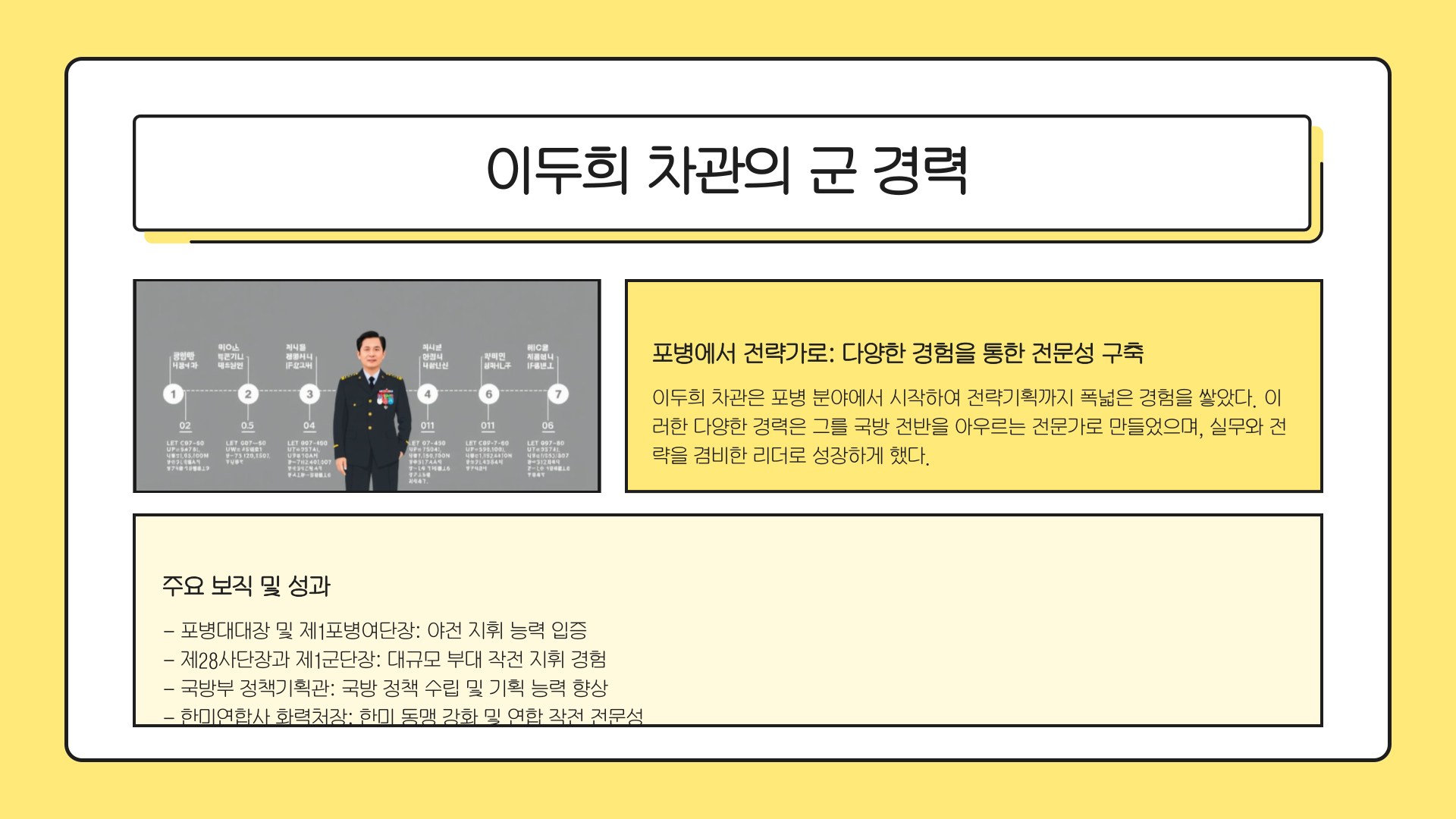 이두희 차관의 군 경력은 화력 운용부터 전략기획까지 고르게 분포되어 있습니다. 포병대대장, 제1포병여단장으로 야전 지휘능력을, 제28사단장과 제1군단장으로 작전 능력을, 국방부 정책기획관 및 한미연합사 화력처장으로 전략기획 역량을 검증받았습니다. 이러한 배경은 그가 단순한 지휘관이 아닌 국방 전체를 조망할 수 있는 전략가로 평가받게 만들었죠.
