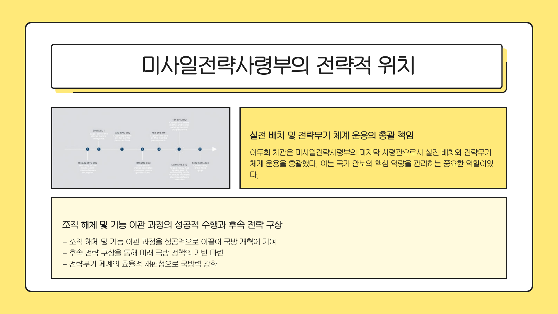 이두희 차관이 마지막으로 맡았던 보직은 육군 미사일전략사령부 사령관입니다. 이 부대는 정밀유도무기와 탄도미사일, 다연장로켓 등을 통합 운용하는 국가 전략 전력입니다. 그는 이 조직의 해체 및 기능 이관 과정까지 성공적으로 이끌었고, 이는 후속 전략 구상에 탄탄한 기반이 되었죠.