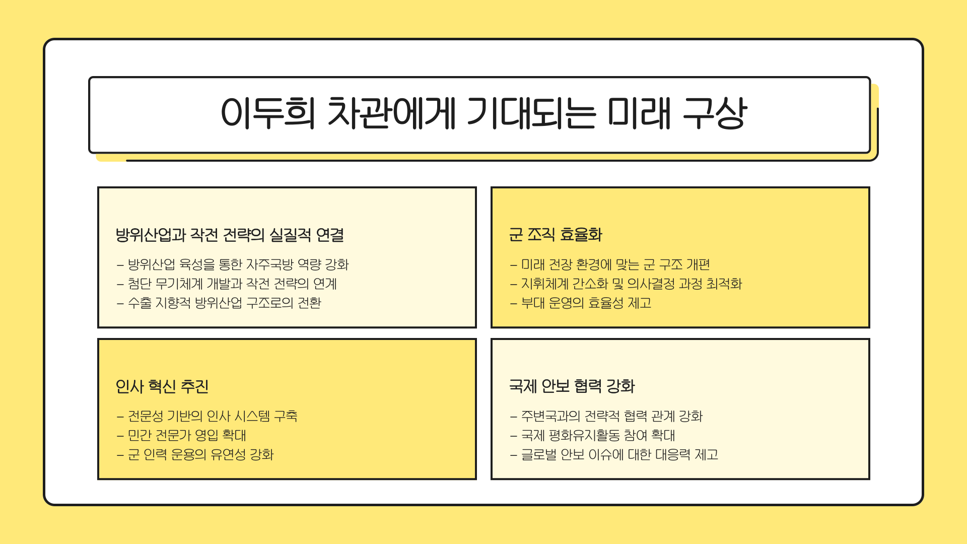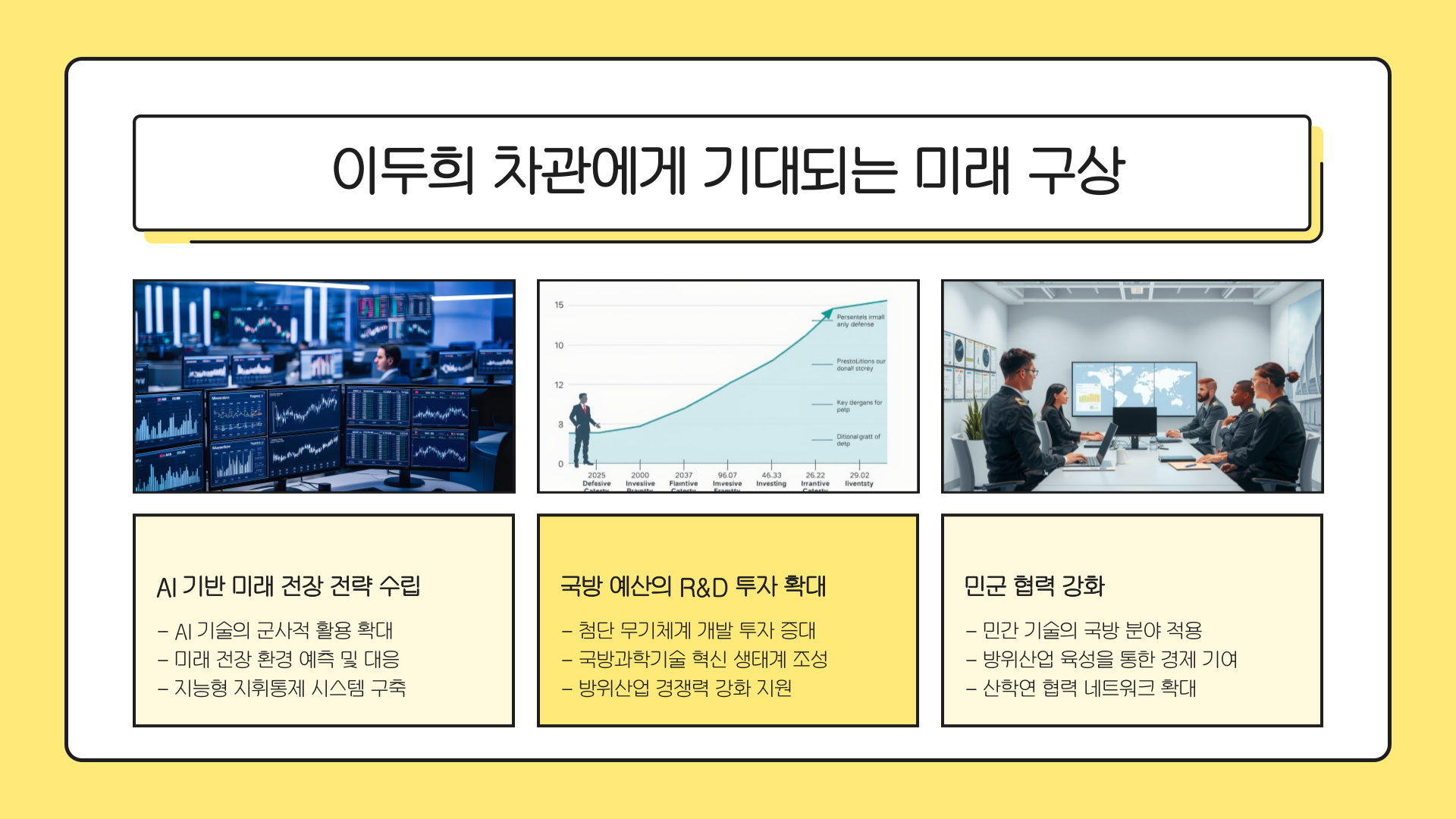 그의 전략적 사고와 실무 중심 리더십은 미래 국방정책에서 다음과 같은 핵심 역할로 이어질 가능성이 큽니다.