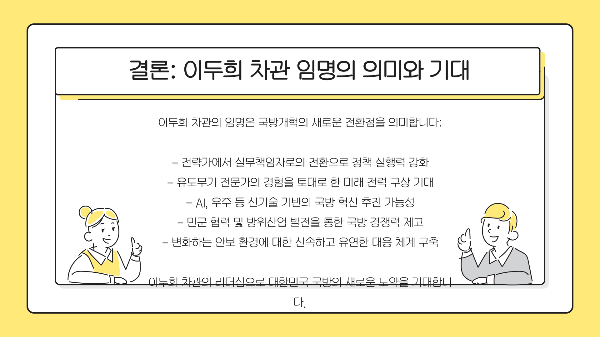 이 차관 임명은 단순한 관료 인사가 아니라 이재명 정부의 국정 철학이 반영된 행보로 볼 수 있습니다. 방위산업과 국방 R&D의 민군 연결, AI 기반 작전환경 대응 같은 미래형 정책 이슈와 깊게 연결되어 있습니다.