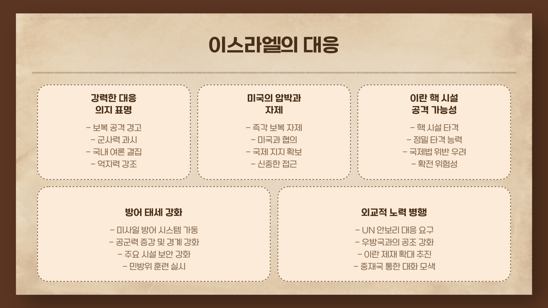- 중동 국가들: 자국 안전 우려, 분쟁 확산 경계