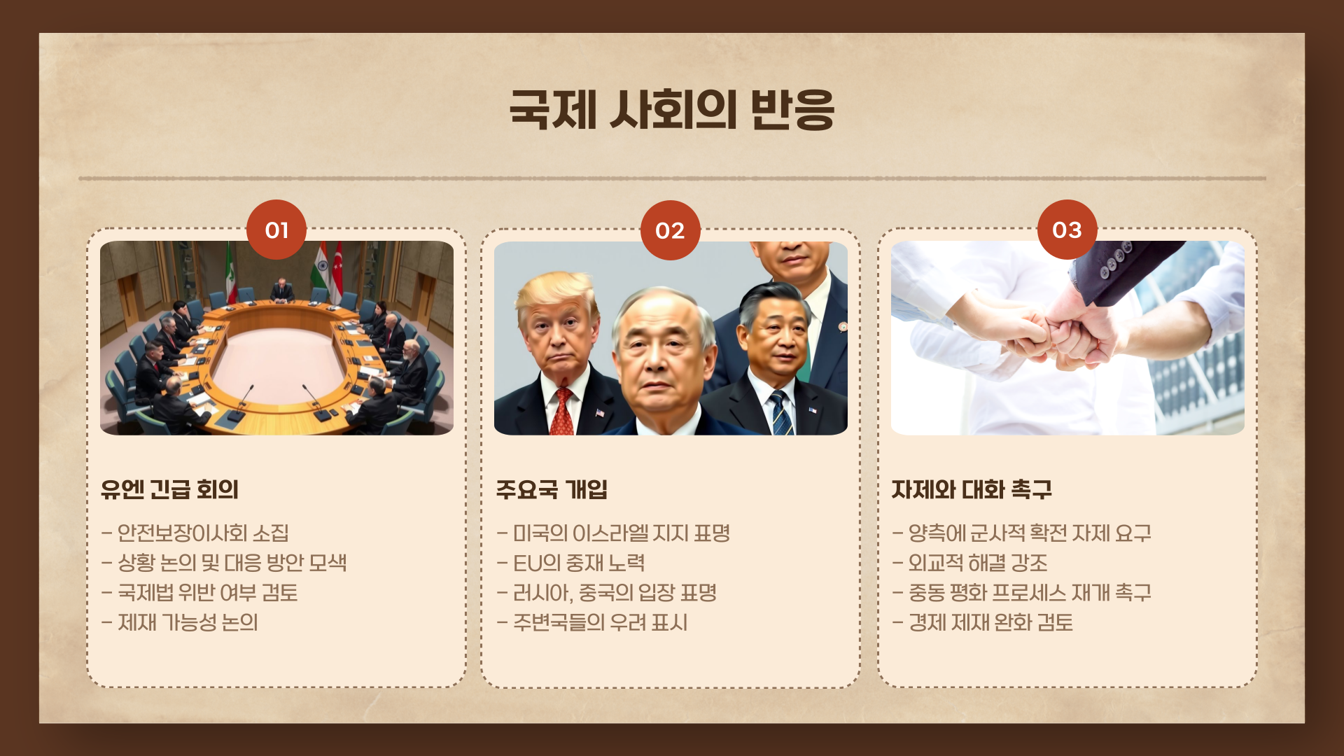 이스라엘의 공습과 이란의 대응으로 상황이 걷잡을 수 없이 악화되자, 국제 사회도 즉각적인 반응을 보이고 있어요. 유엔은 긴급 회의를 열고, 주요국들은 외교적 해법을 촉구했죠. 아래는 주요 반응 요약이에요.