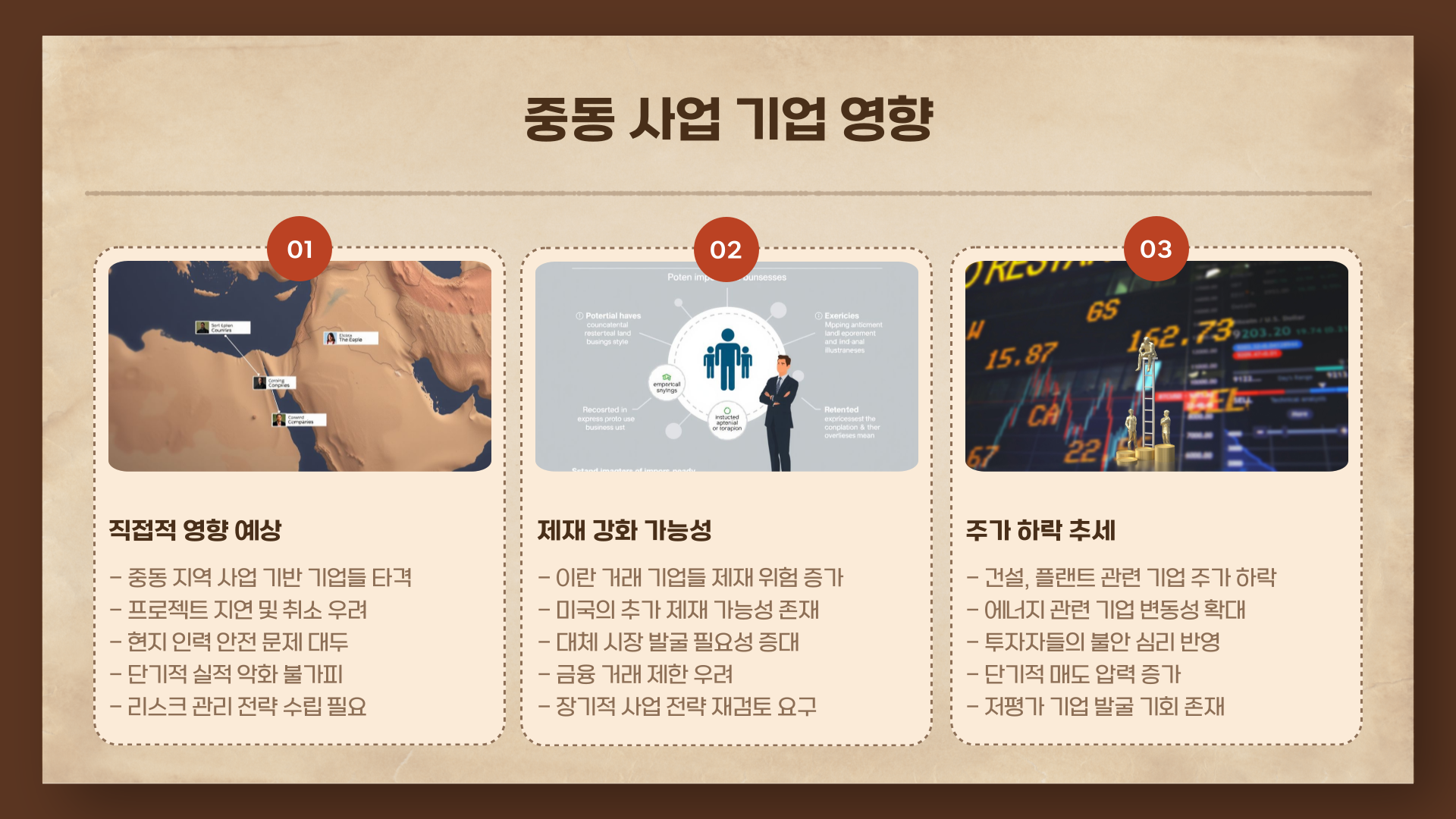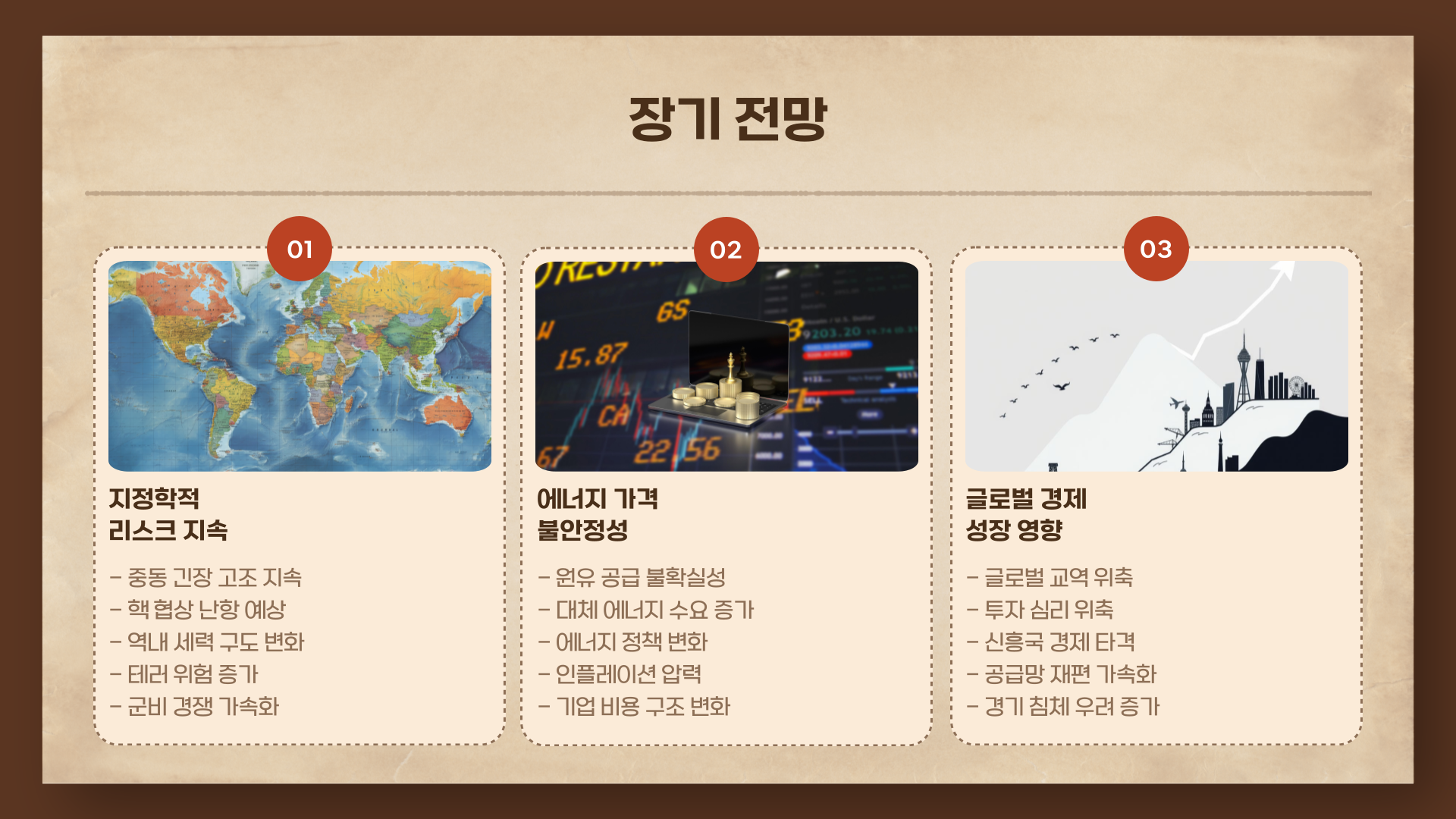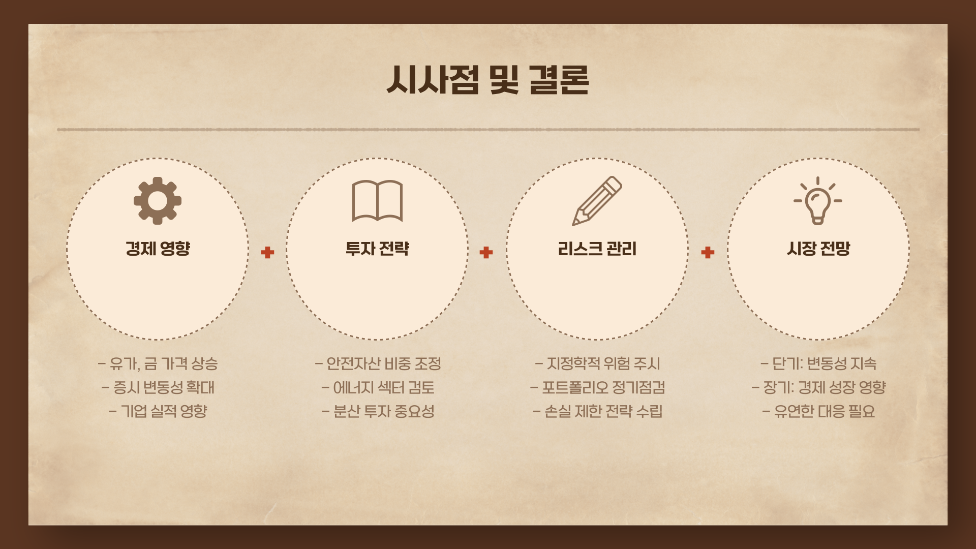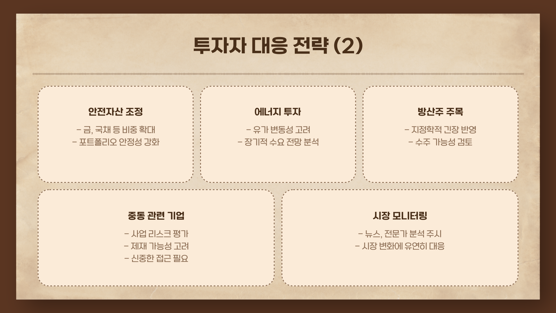 주요 지정학적 사건은 증시에 단기적인 충격을 줄 수 있으며, 특히 에너지 및 방산 업종에 변동성을 유발합니다.