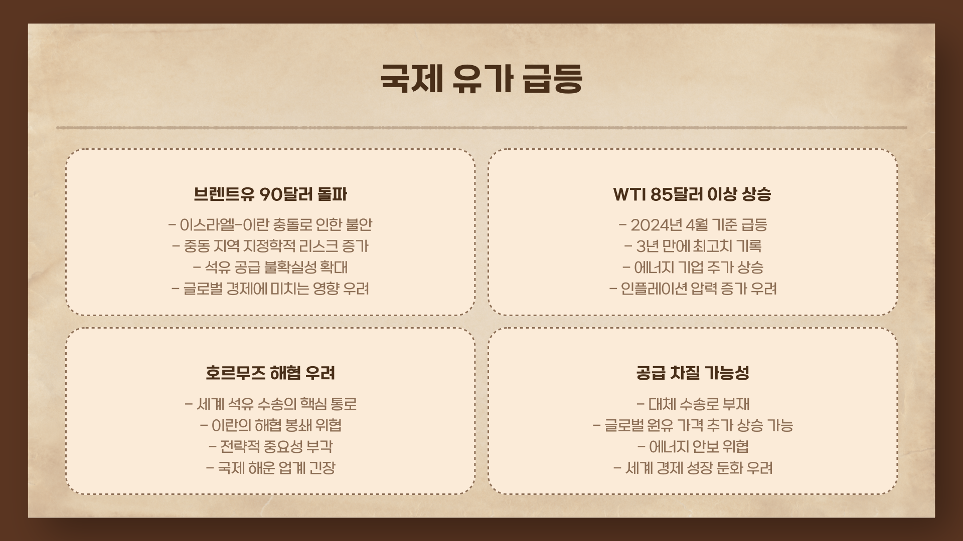 중동 지역은 세계 주요 산유국들이 밀집한 곳이라 유가에 대한 민감도가 클 수밖에 없어요. 이번 이스라엘-이란 갈등 격화로 인해 브렌트유와 WTI 모두 배럴당 85~90달러 수준까지 상승했죠. 동시에 안전 자산인 금도 온스당 2,400달러를 돌파하며 사상 최고치를 기록했어요. 아래 표에서 최근 변동 현황을 정리해볼게요.