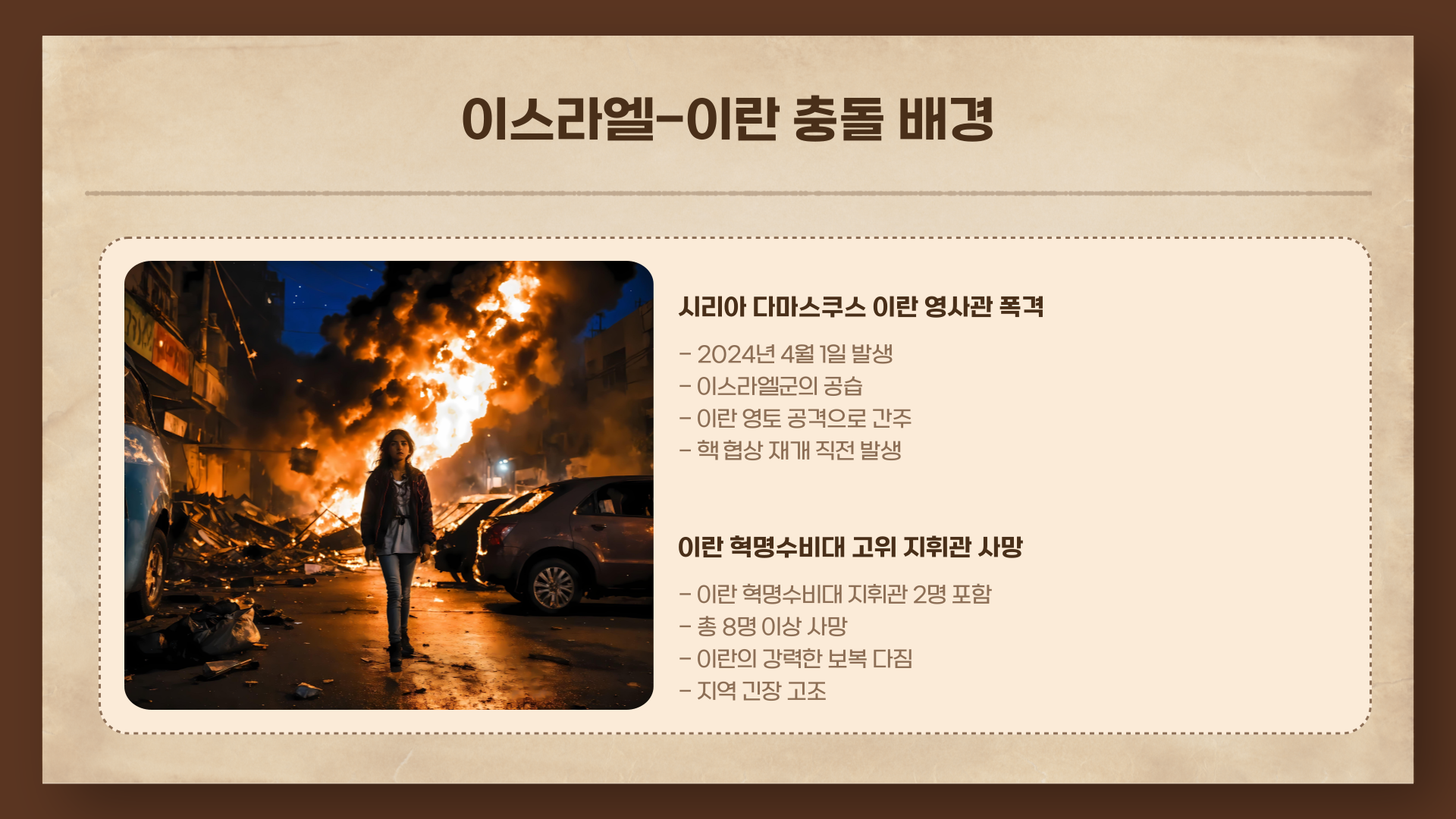이번 충돌은 단순한 국경 분쟁이 아니었어요. 이스라엘이 시리아 다마스쿠스에 위치한 이란 영사관을 폭격하면서, 이란은 이를 자국 주권에 대한 명백한 침해로 간주했죠. 이 폭격으로 이란 혁명수비대 고위 간부들이 사망했고, 이는 이란 내 강경파의 분노를 촉발했어요. 특히 이 사건은 이란과 미국 간의 핵 협상이 재개되기 바로 이틀 전 발생했기 때문에, 정치적인 의도와 외교 전략이 얽혀 있다는 분석도 제기되고 있습니다. 이스라엘은 이란의 핵 개발 속도를 막기 위해 선제적으로 행동했을 가능성도 크고요.
