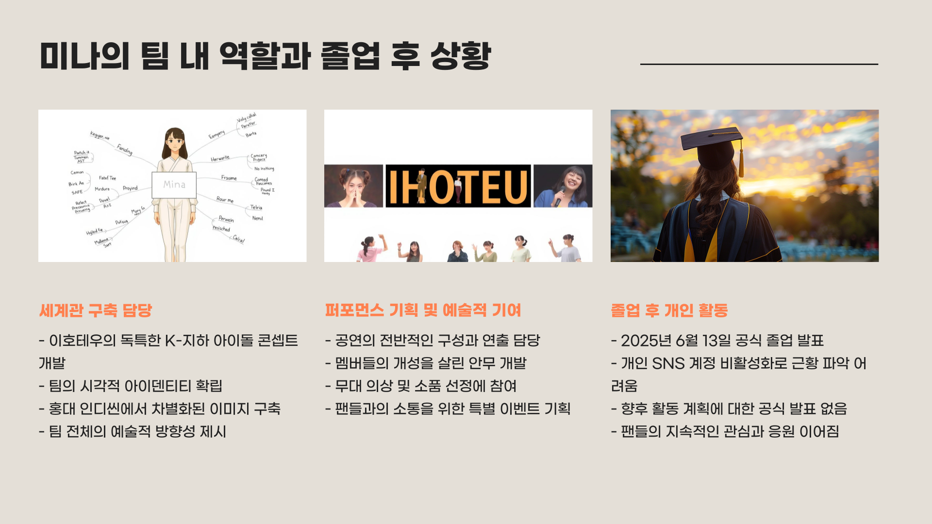 팀의 세계관을 구축하고 시각적인 퍼포먼스를 기획하는 등 예술적 기여도가 높은 멤버였어요. 졸업 후 현재는 개인 활동이 알려지지 않았습니다.
