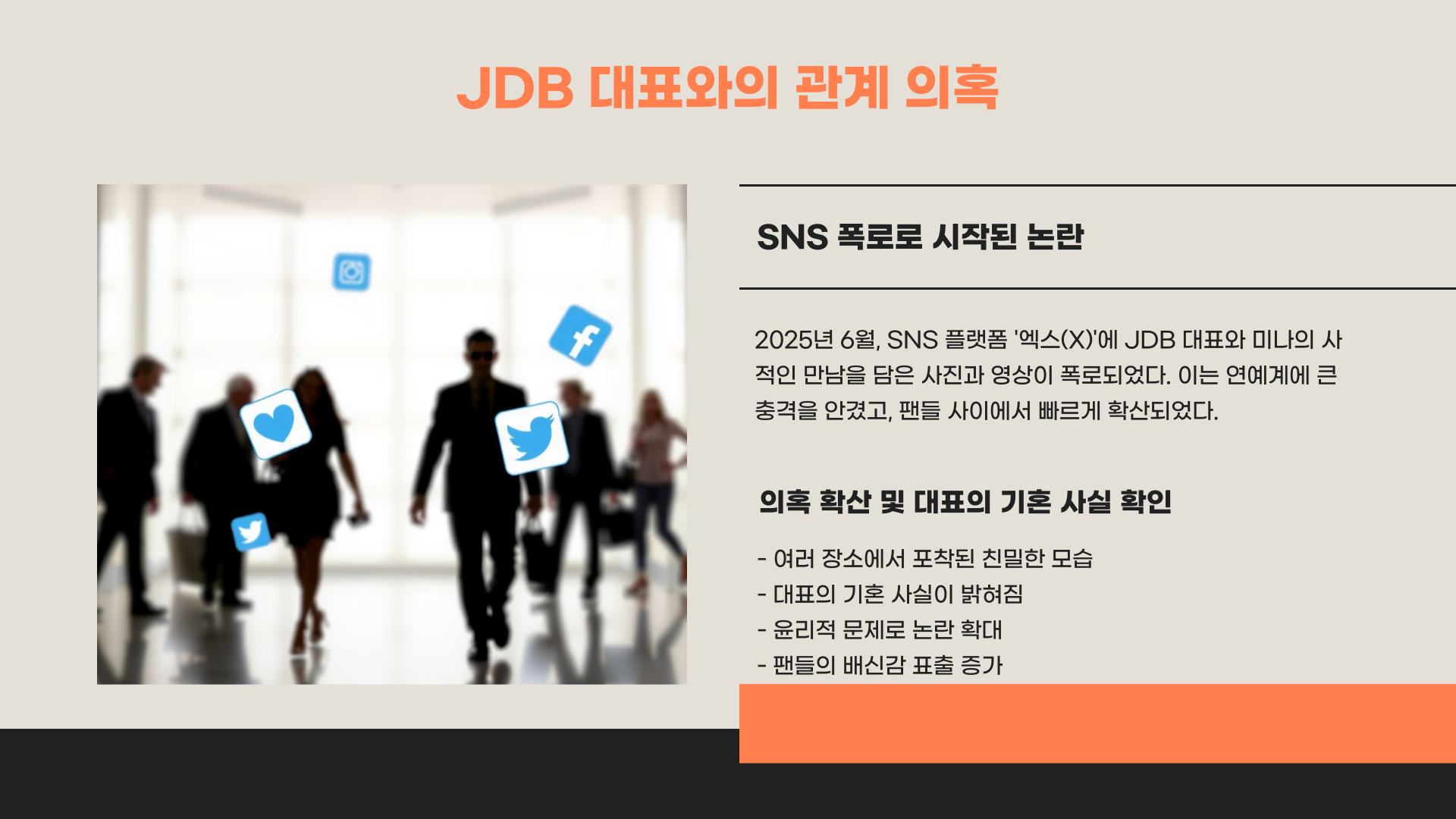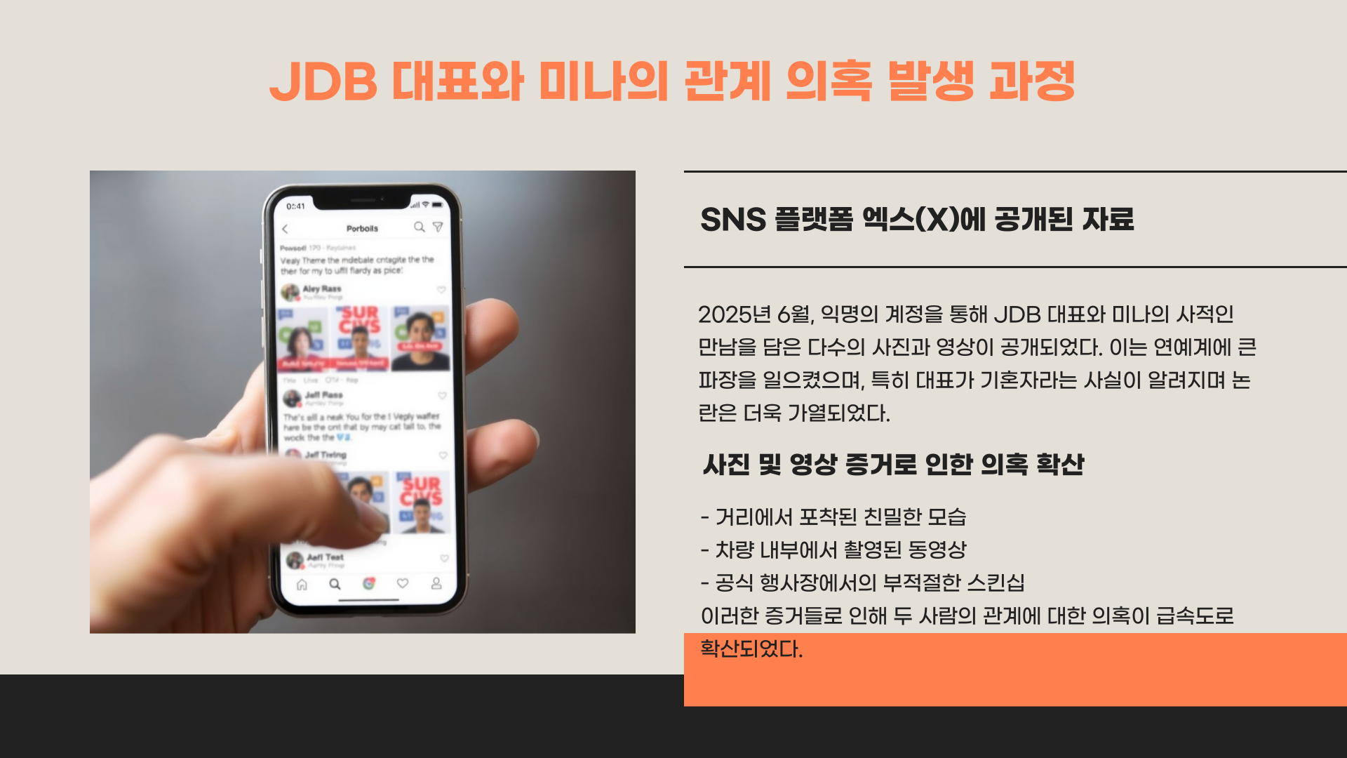 2025년 6월, SNS 플랫폼 ‘엑스(X)’에 폭로된 글 하나가 모든 이슈의 출발점이었습니다. 게시물에는 JDB 대표와 미나가 사적으로 시간을 보내는 모습이 다수의 사진과 영상으로 담겨 있었고, 이들 간의 관계에 대한 의혹이 빠르게 퍼졌습니다. 특히 대표가 기혼자였다는 사실이 드러나며, 팬들뿐 아니라 업계 전체에 충격을 안겼죠.