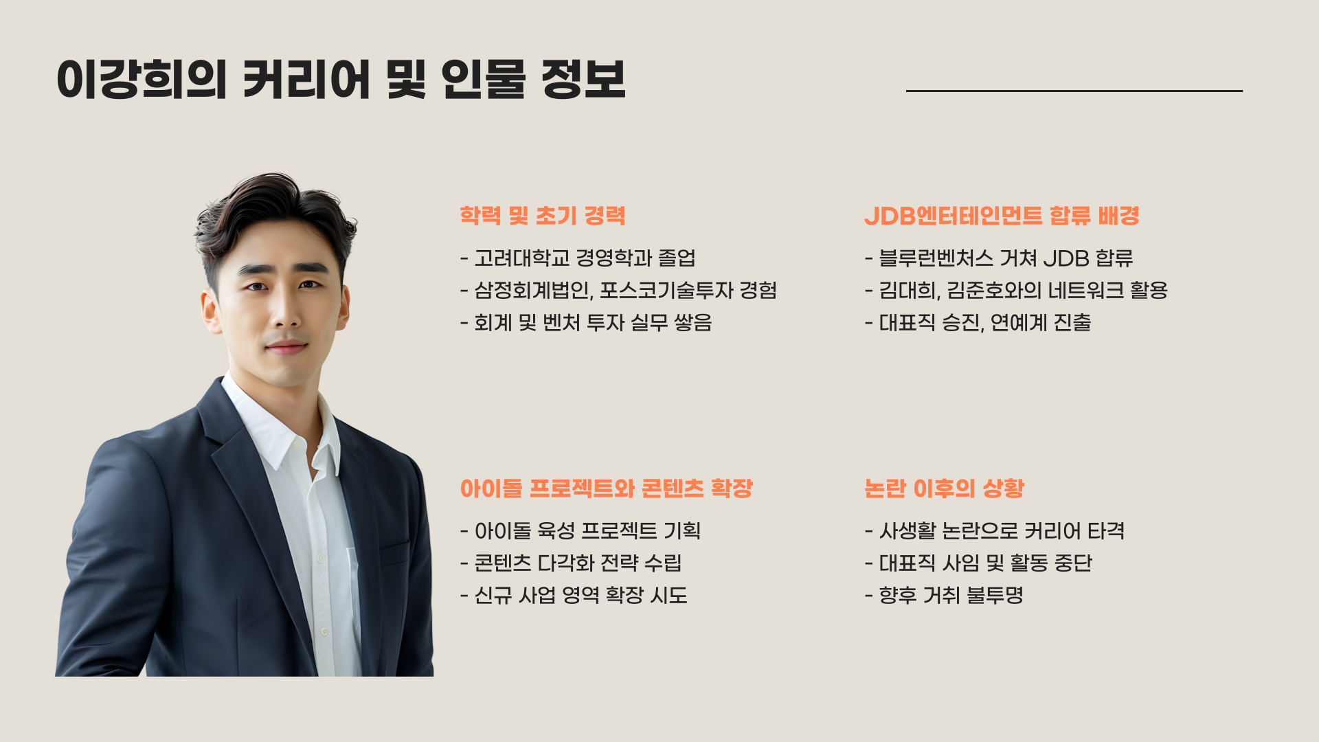 이강희 전 대표는 연예계보다 기업 경영과 투자 쪽에서 먼저 경력을 쌓아온 인물입니다. 고려대학교 경영학과를 졸업하고, 삼정회계법인과 포스코기술투자 등에서 회계 및 벤처 투자 관련 실무를 경험했어요. 이후 블루런벤처스를 거쳐 JDB엔터테인먼트로 합류했는데, 당시 개그맨 김대희와 김준호와의 네트워크를 바탕으로 대표직에 오르게 되었죠. 아이돌 프로젝트와 콘텐츠 확장에 열정을 보였지만, 이번 사건으로 인해 모든 계획이 무산되며 커리어에 큰 타격을 입게 되었습니다.