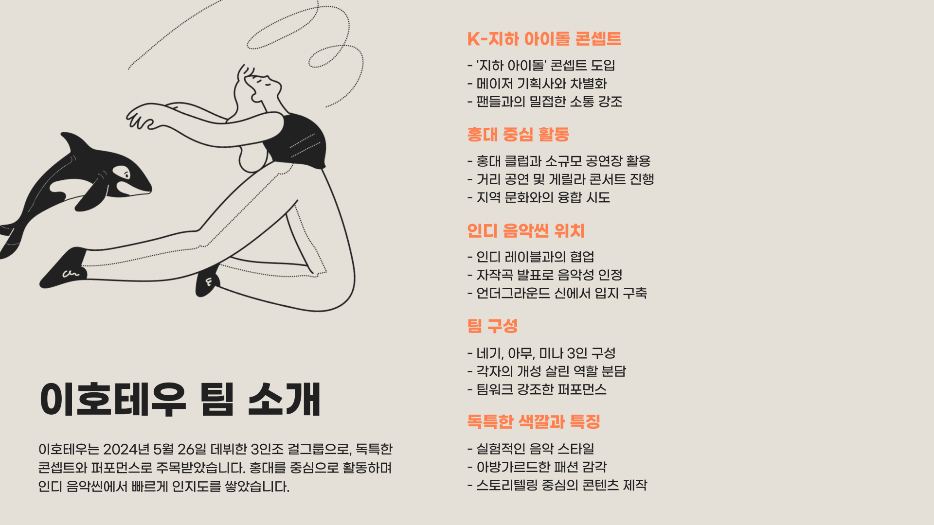 K-지하 아이돌을 표방하며 2024년 데뷔한 독립 아이돌 그룹으로, 서울 홍대를 중심으로 활동하며 인디 음악씬에서 독특한 색깔을 선보였어요.