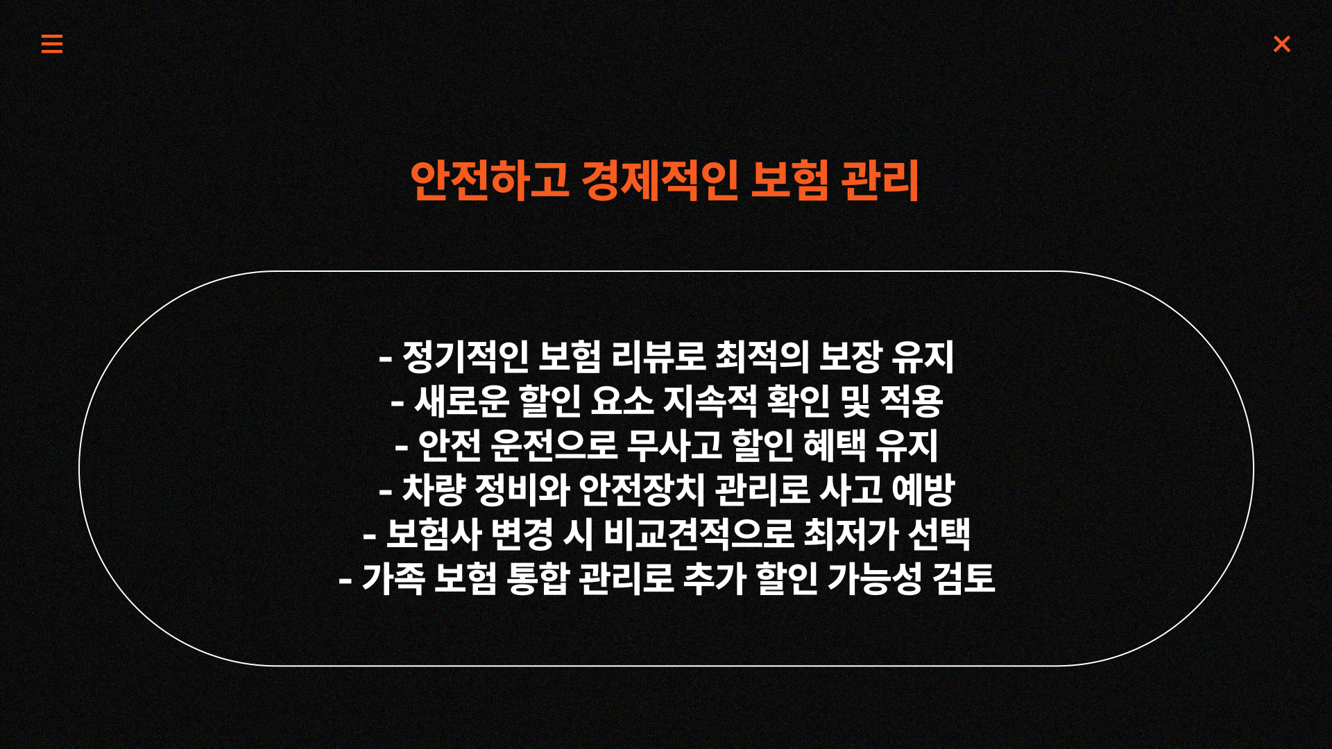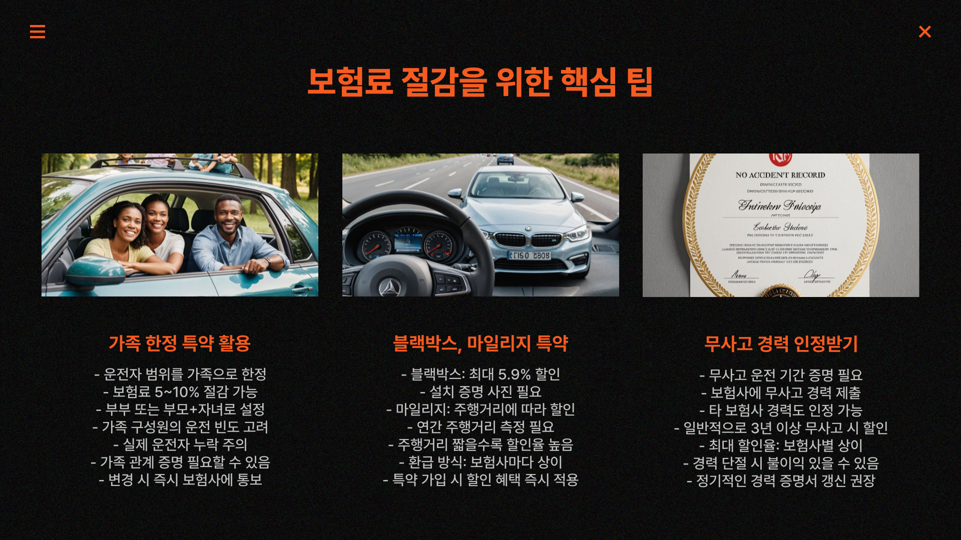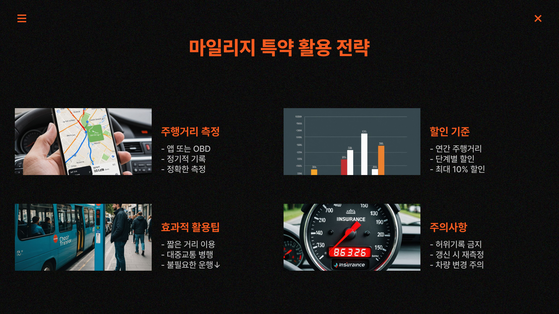 - 마일리지 특약, 블랙박스, 안전장치 할인을 적극 활용하세요.