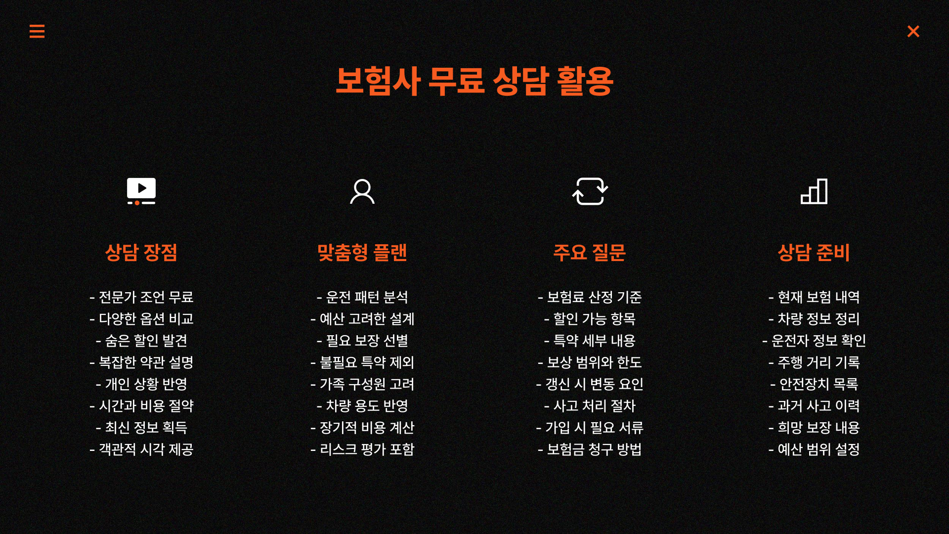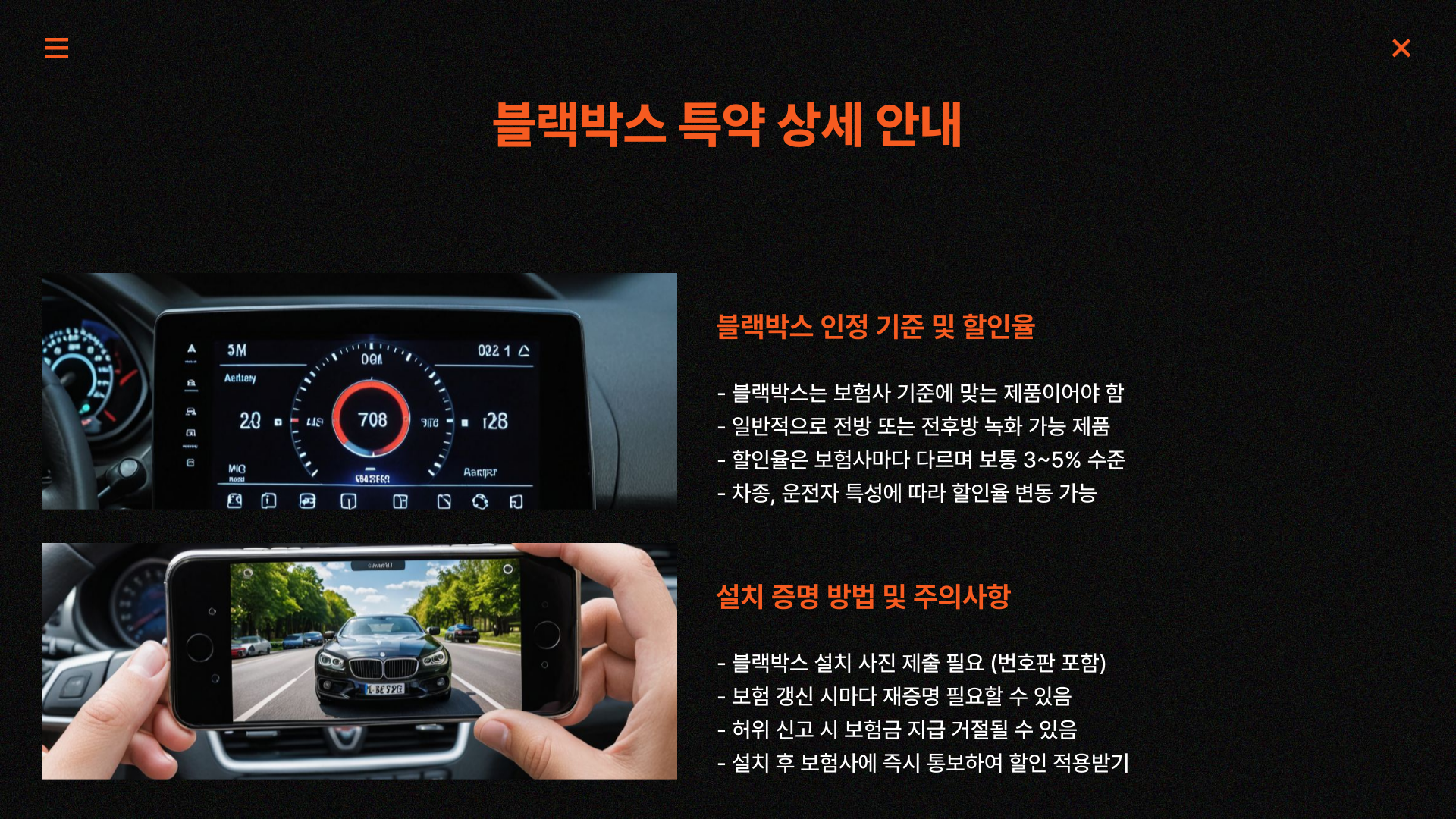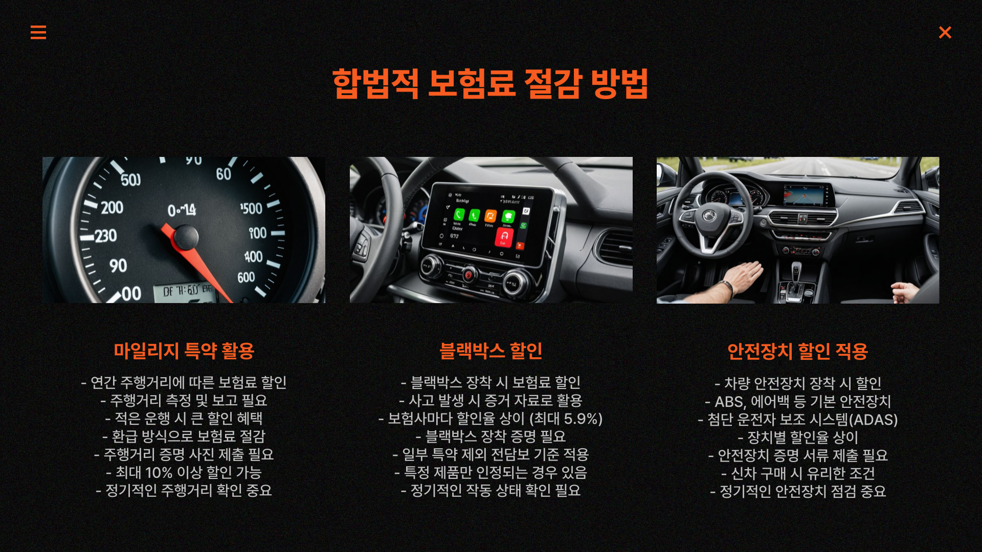 - 마일리지 특약, 블랙박스, 안전장치 할인을 적극 활용하세요.