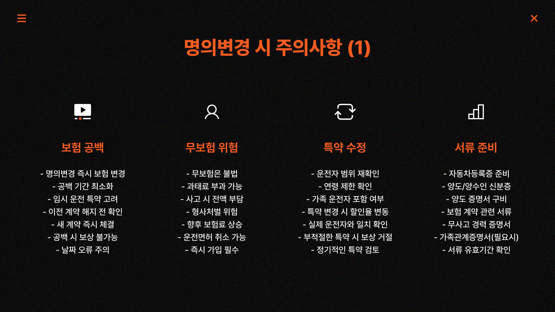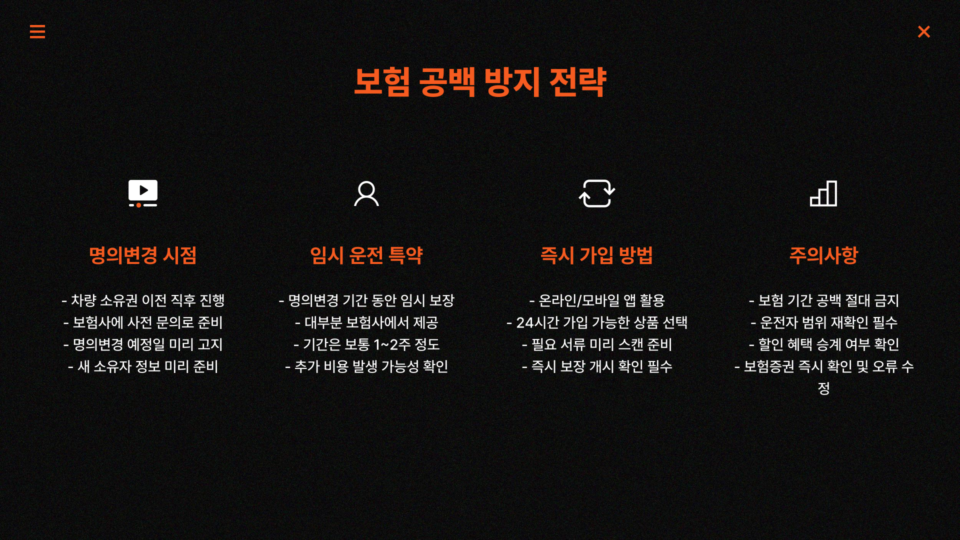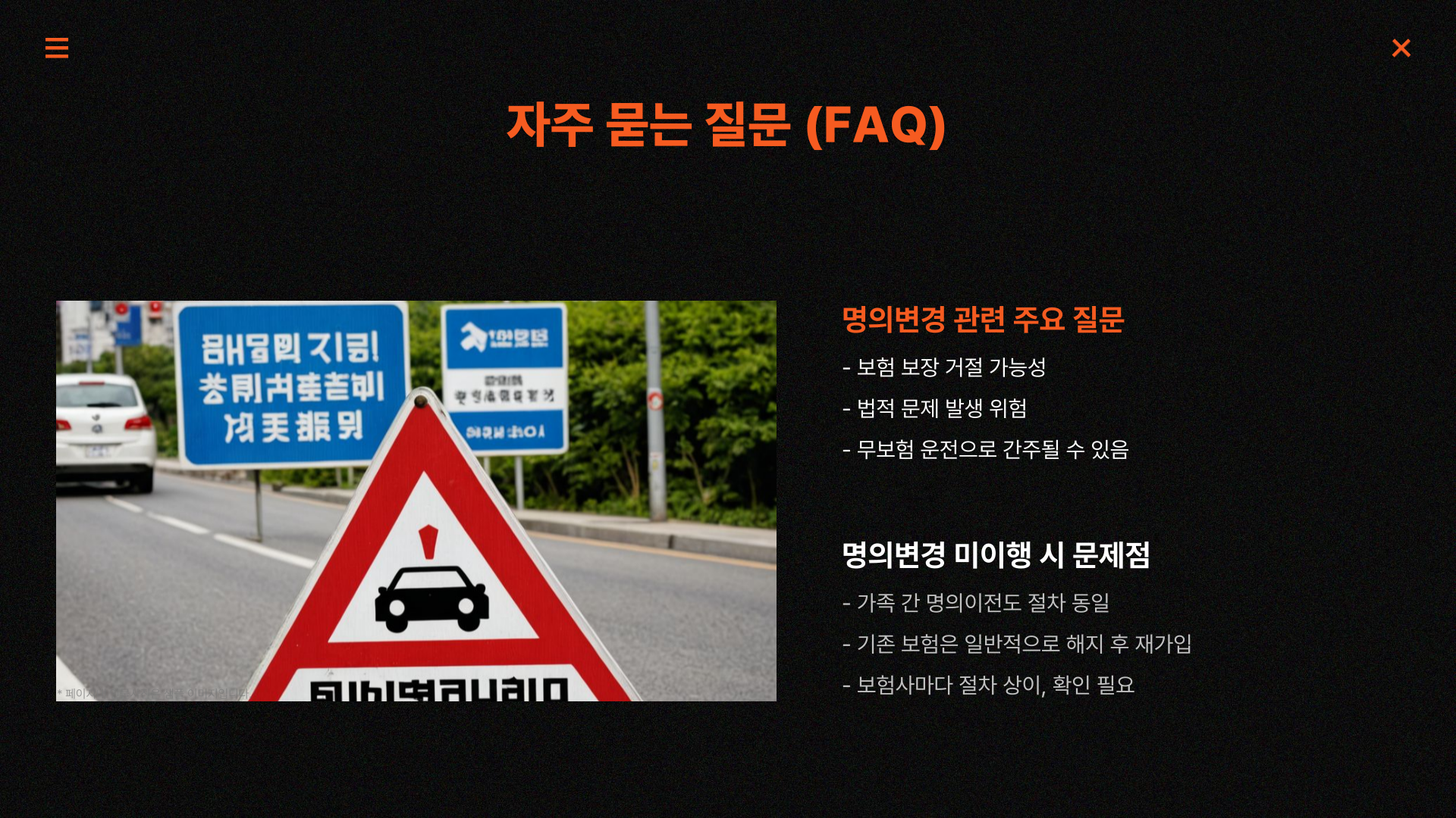 차량 소유권 이전 후 바로 보험 명의도 변경하는 것이 원칙이에요. 늦어질수록 사고 시 불이익이 클 수 있어요.