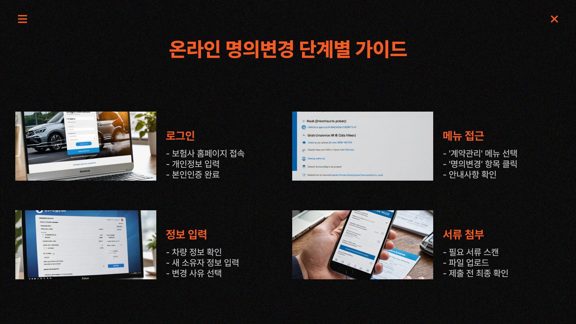 | 온라인 | 홈페이지 로그인 → 명의변경 메뉴 선택 → 서류 제출 | 일부 보험사는 서류 원본 요청 |