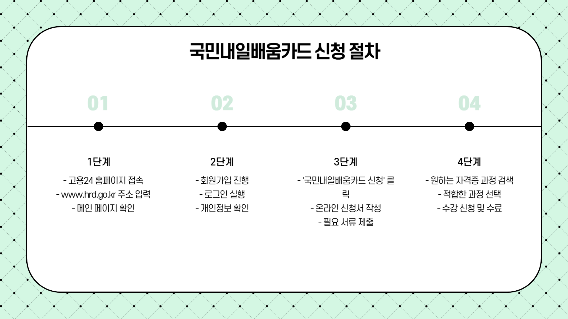 신청방법은 고용24 홈페이지에서 온라인으로 신청하면 됩니다. 단계는 회원가입 → 카드 신청 → 자격 확인 → 수강 신청 순입니다.
