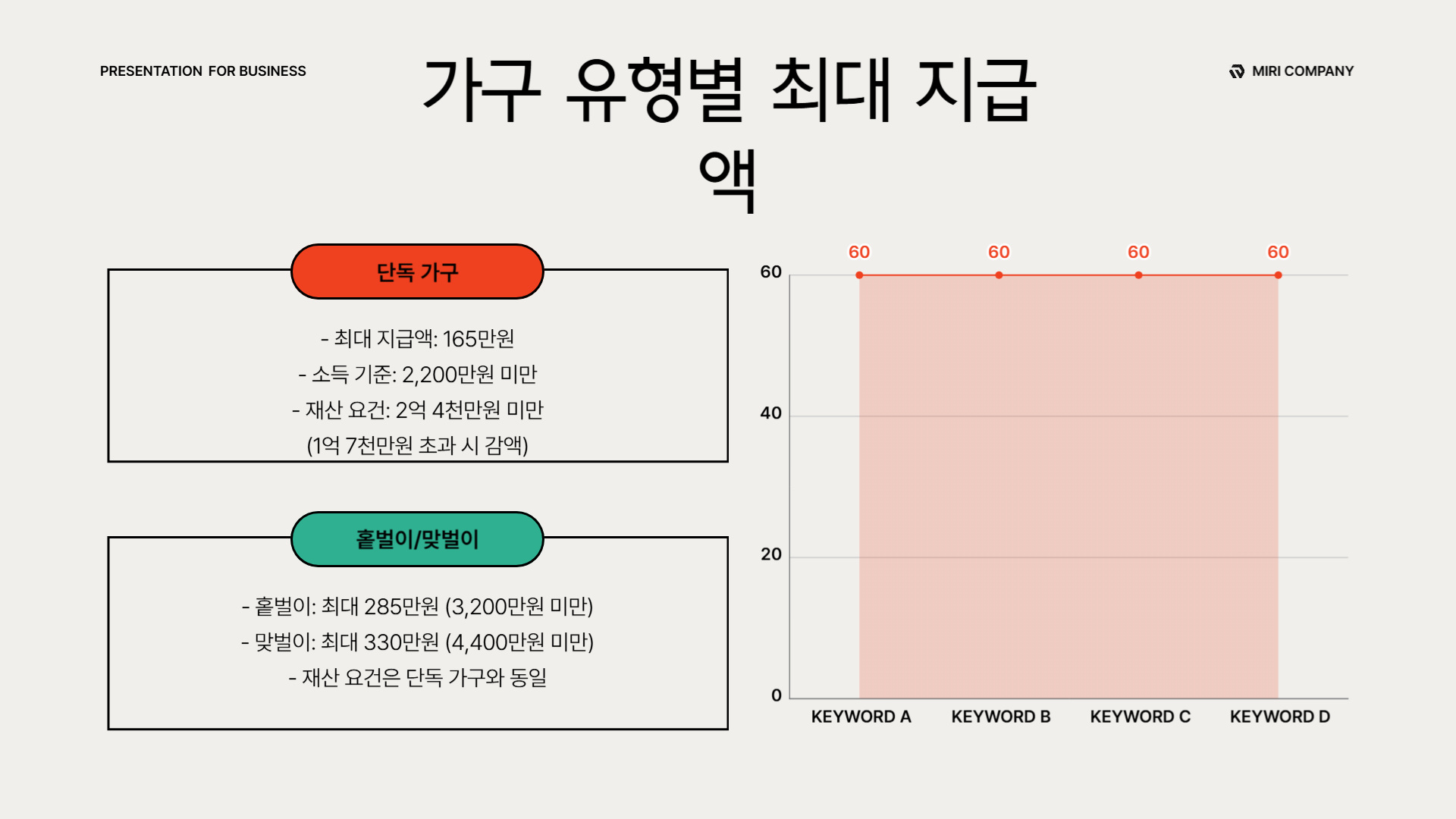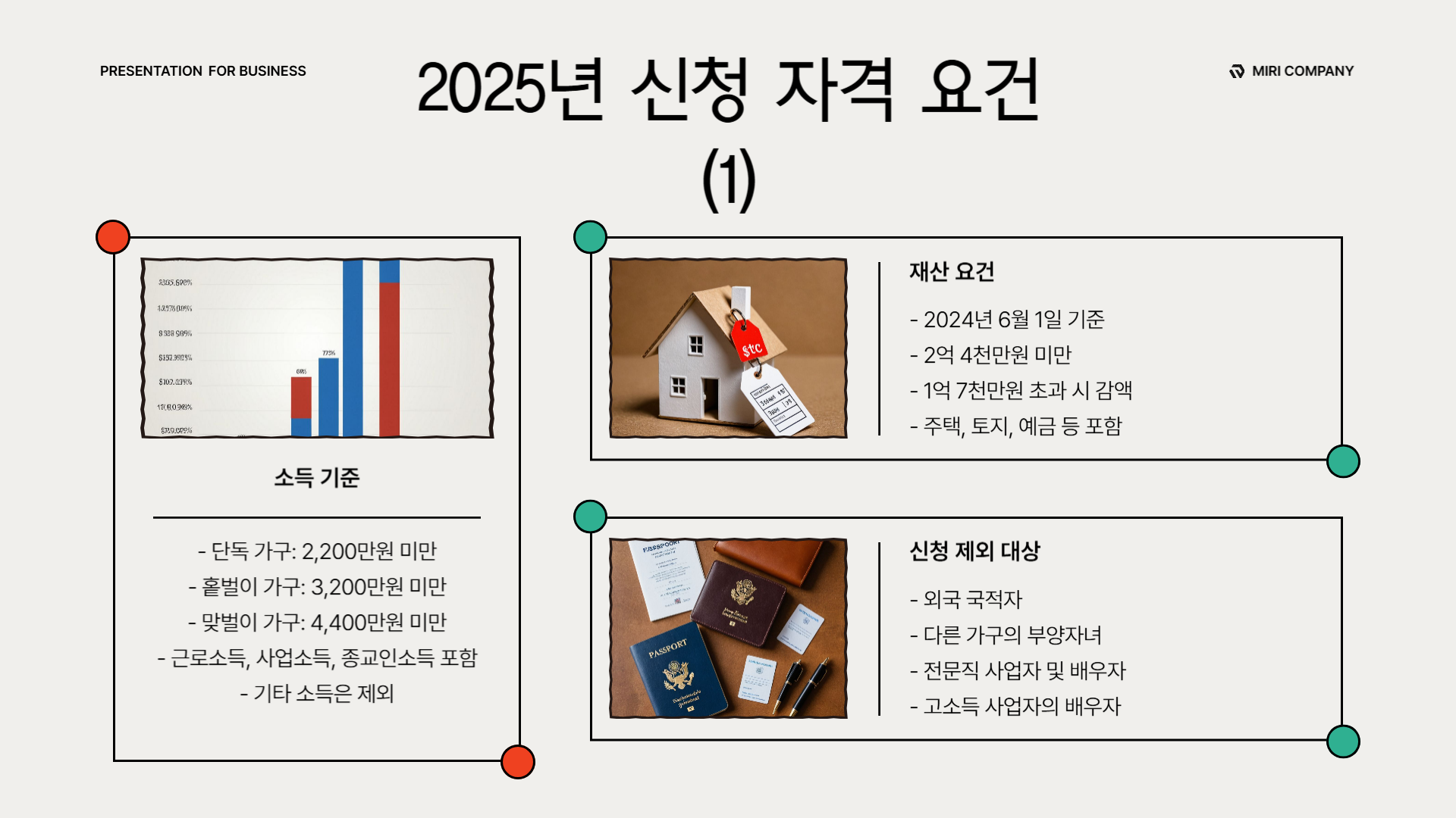| 소득 요건 | 단독 가구: 2,200만원 미만 홑벌이 가구: 3,200만원 미만 맞벌이 가구: 4,400만원 미만 |